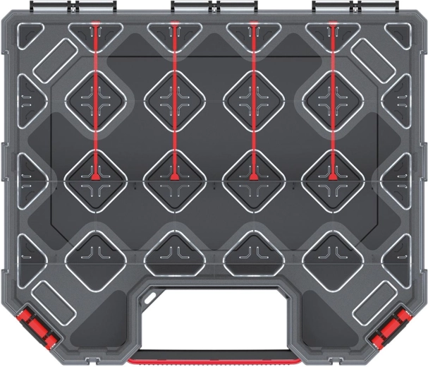 Dimensiunile compacte 284 × 243 × 105 mm se potrivesc în rafturi, dulapuri și genți pentru scule. Construcția robustă și clemele fiabile asigură că totul rămâne la locul său, fie în atelier, pe șantier sau în mașină.