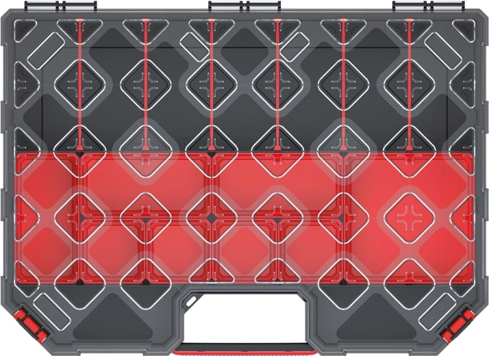 Păstrați ordinea și aveți totul la îndemână. Organizatorul înalt TAGER CARBO PLUS cu dimensiunile 390 × 284 × 105 mm oferă suficient spațiu pentru șuruburi, burghie, biți, elemente de fixare și alte componente mici. Construcția robustă și capacul din policarbonat transparent asigură durabilitate și o bună vizibilitate a conținutului.