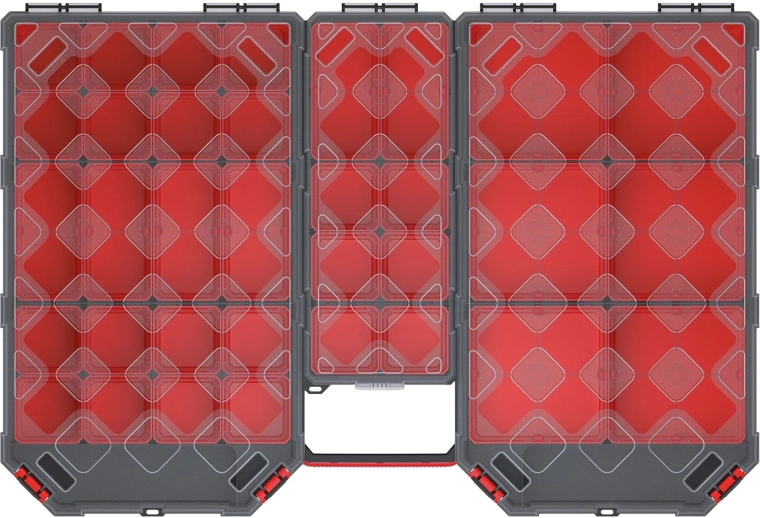 Organizatorul practic TAGER cu dimensiunile 577 × 390 × 60 mm oferă depozitare clară și ordonată pentru piese mici și unelte. Datorită capacului transparent din polipropilenă (PP) rezistentă, vezi ușor conținutul fără a fi nevoie să deschizi. Ideal pentru atelier, garaj și casă, pentru organizare eficientă și acces rapid la lucrurile necesare.