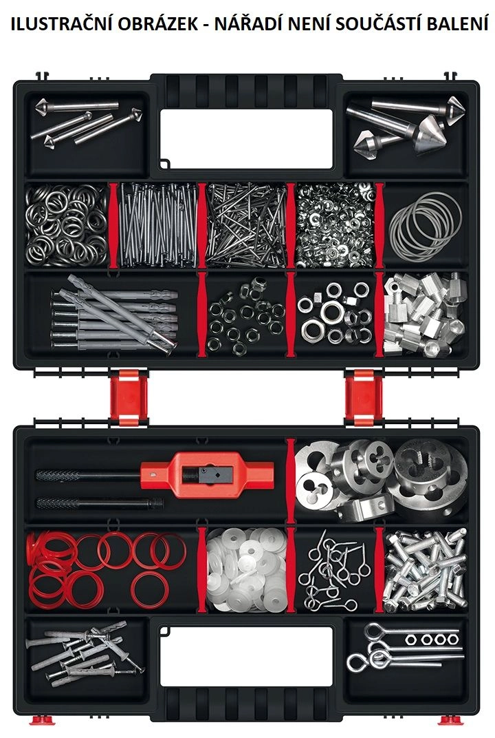 Spațiul interior se adaptează cu ajutorul despărțitoarelor detașabile – creați compartimente mici, medii sau mai mari exact după necesitățile curente. Construcția robustă și închiderile fiabile protejează materialul depozitat împotriva vărsării și deteriorării, atât în atelier, cât și în deplasare.