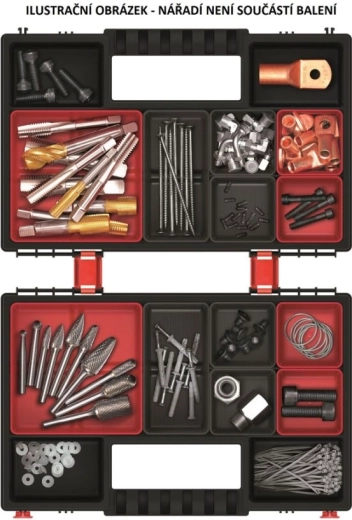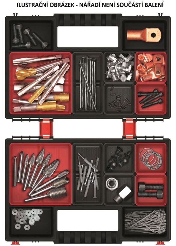 Fiecare organizator include 6 compartimente detașabile, pe care le puteți aranja în funcție de nevoi. Încuietorile robuste și mânerul ergonomic asigură o prindere sigură și un transport protejat, în timp ce corpul rezistent din amestec polimeric face față utilizării zilnice în atelier și pe șantier.
