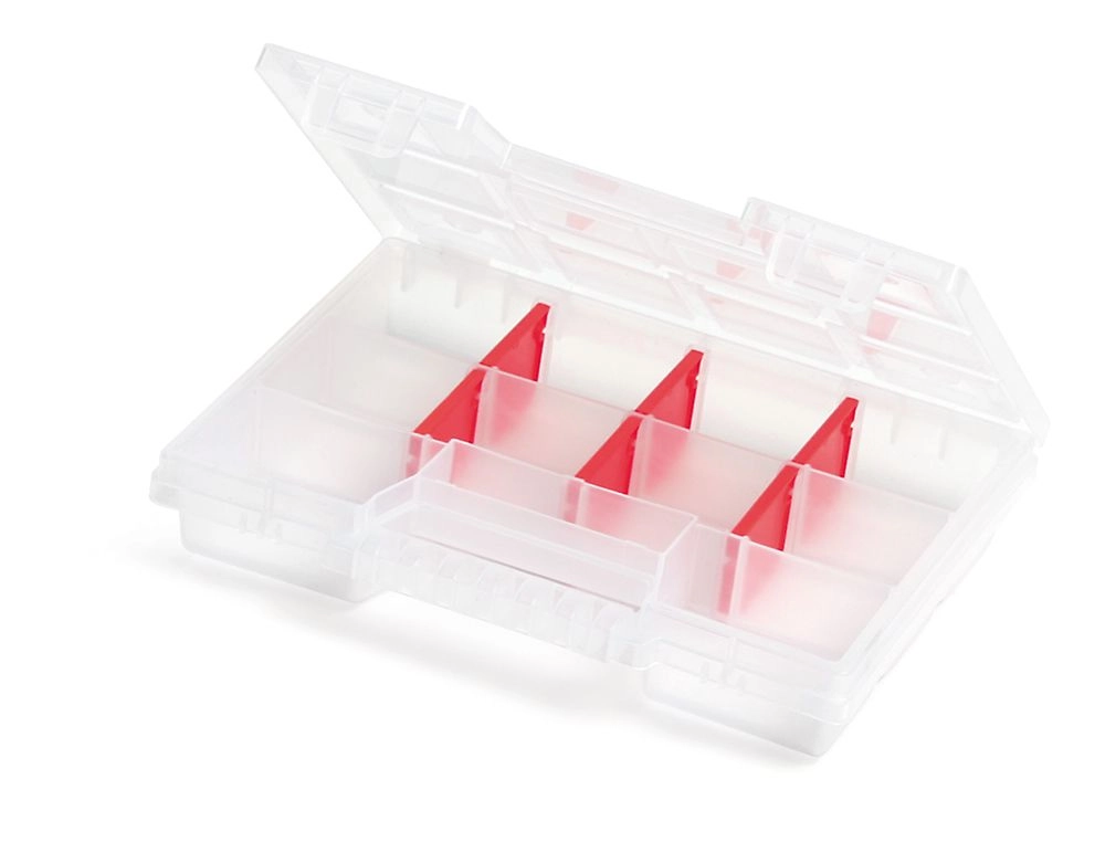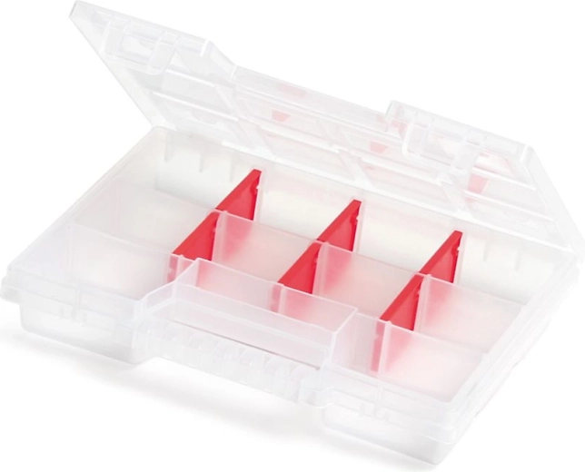 Organizatorul practic din plastic NORT, cu 10 compartimente, este ideal pentru depozitarea ordonată a șuruburilor, piulițelor sau componentelor electronice. Datorită execuției transparente, aveți o vedere imediată asupra conținutului fără a fi nevoie să deschideți. Despărțitoarele detașabile permit ajustarea variabilă a dimensiunii compartimentelor, în timp ce dimensiunile compacte și greutatea redusă asigură transportul facil. Construcția durabilă din plastic și mânerul practic fac din acest organizator un ajutor de încredere acasă, în atelier și pe teren.