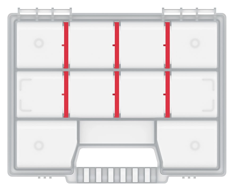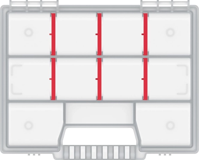 Mențineți ordinea în materialele de fixare mici și în componente cu organizatorul NORT. Capacului transparent oferă o vedere rapidă, astfel încât știți imediat unde aveți fiecare lucru. Datorită despărțitoarelor detașabile, vă personalizați cu ușurință spațiul interior exact în funcție de nevoile actuale.