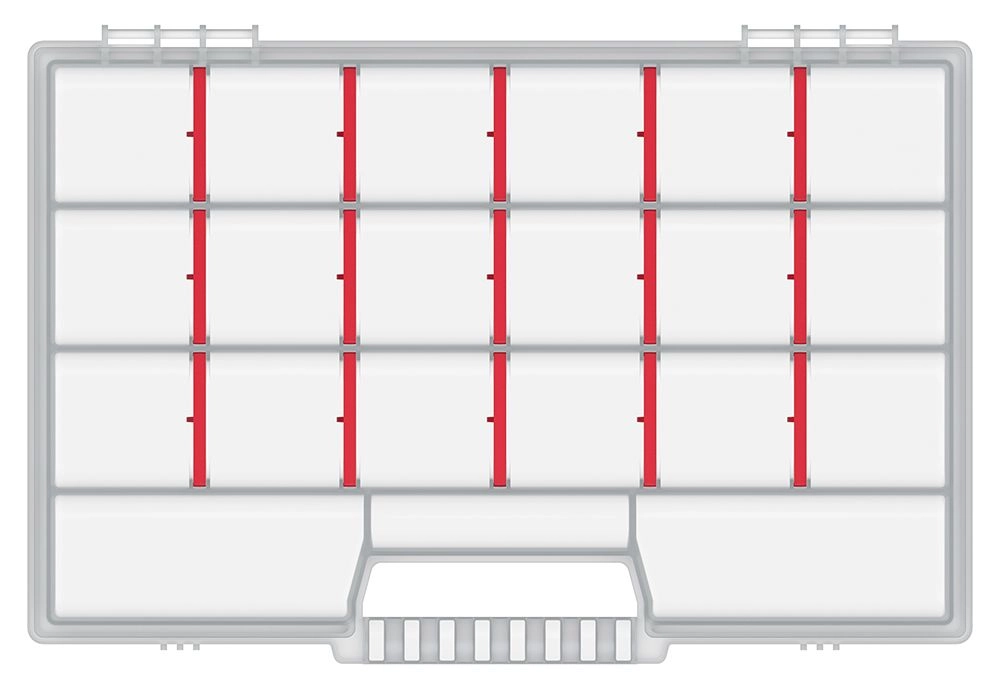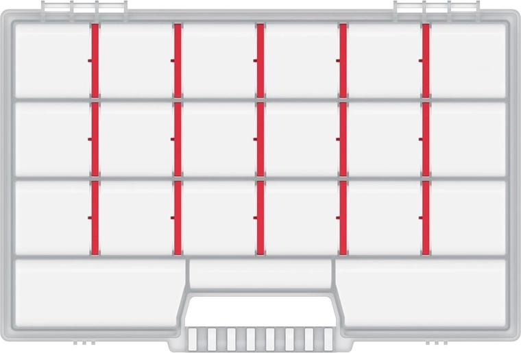 Configurația flexibilă este posibilă datorită despărțitoarelor detașabile, astfel încât îți setezi simplu dimensiunea compartimentelor în funcție de nevoi. Mânerul robust asigură un transport comod și sigur, fie că lucrezi acasă, în garaj sau în deplasare.
