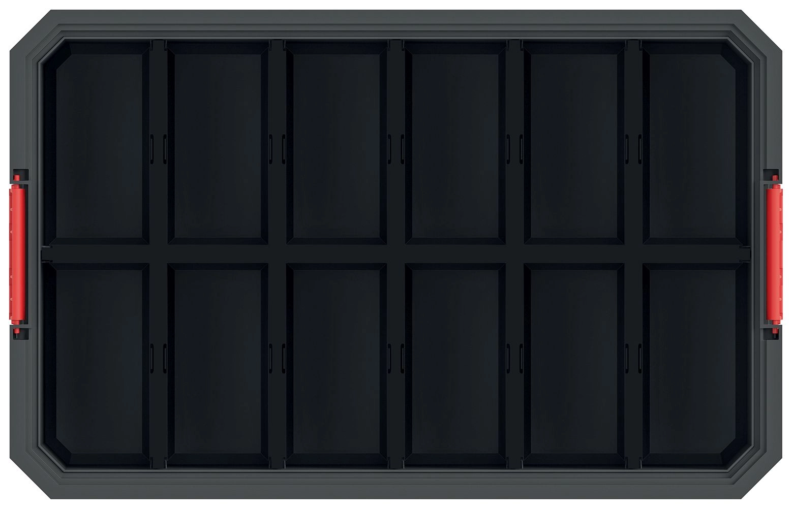 Ajustați interiorul cutiei exact în funcție de natura materialului depozitat. Structura compartimentată tip grilă și divizoarele mențin șuruburile, bițiile și piesele mici clar separate.