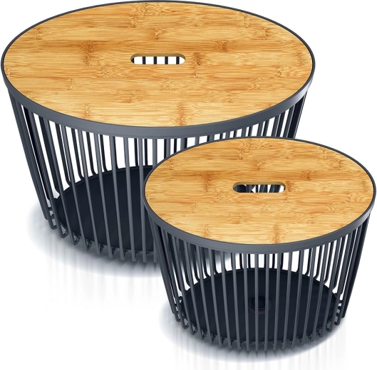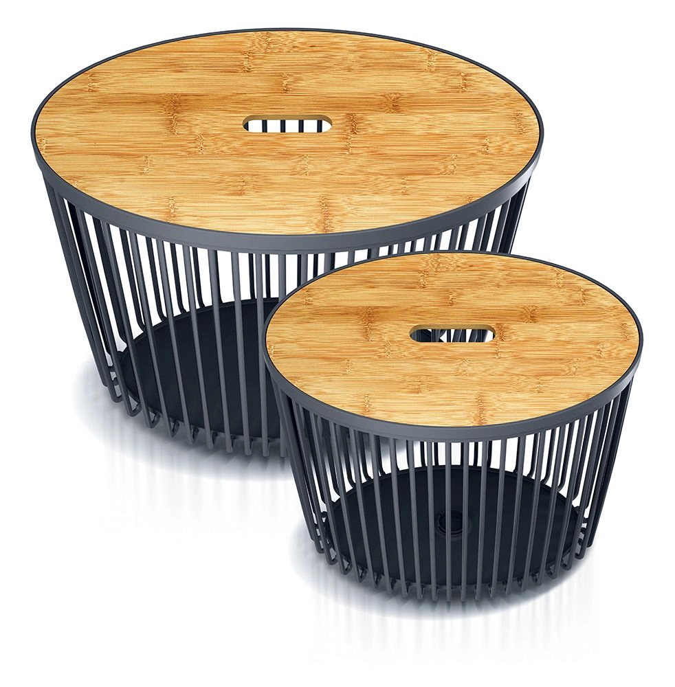 Setul de coșuri CLUBO oferă o soluție inteligentă pentru curățenie și organizare. Datorită celor două dimensiuni (30 și 55 l), adaptați ușor spațiul de depozitare nevoilor actuale – de la rufe la pături și până la jucării pentru copii. Corpul antracit este completat de capace elegante din bambus, care ascund conținutul și adaugă un accent natural interiorului.