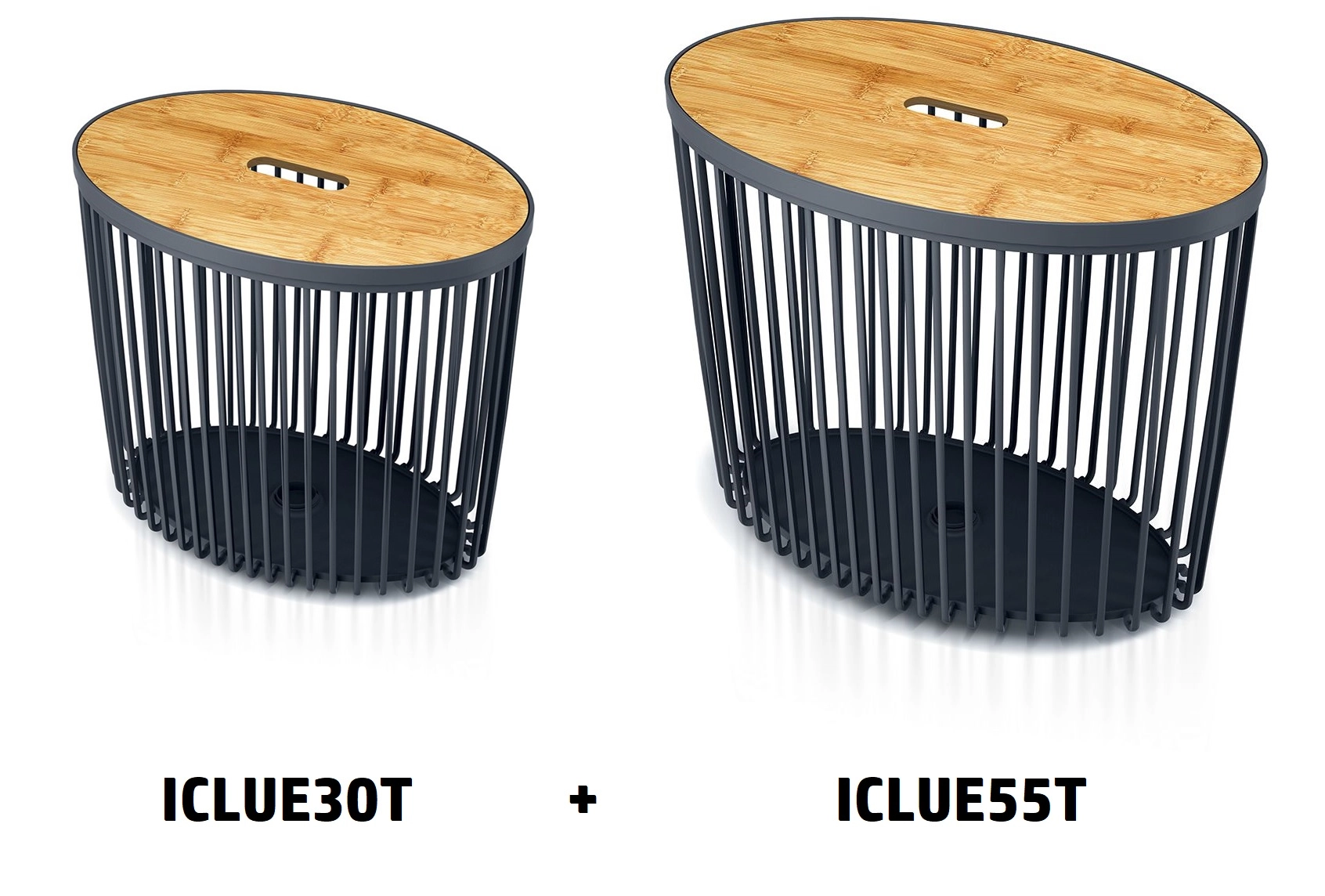 Set practic de două coșuri ovale CLUBO cu volume de 30 și 55 litri, în culoarea elegantă antracit, cu capace din bambus natural. Ideal pentru sortarea rufelor, depozitarea jucăriilor sau organizarea casei. Combină designul modern cu funcționalitatea, întreținerea ușoară și un aspect atemporal. Utilizare universală, combinație stilată de bambus și plastic și două volume pentru flexibilitate maximă.