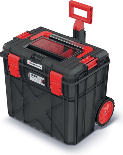 Troler profesional pentru unelte cu roți de transport X-Block Alu Log oferă construcție robustă, rezistență la praf și apă și sistem modular de conectare cu alte boxuri. Sinele de aluminiu integrate în capac pentru masă de lucru și mânerul telescopic asigură o manevrare comodă chiar și la încărcare maximă.
