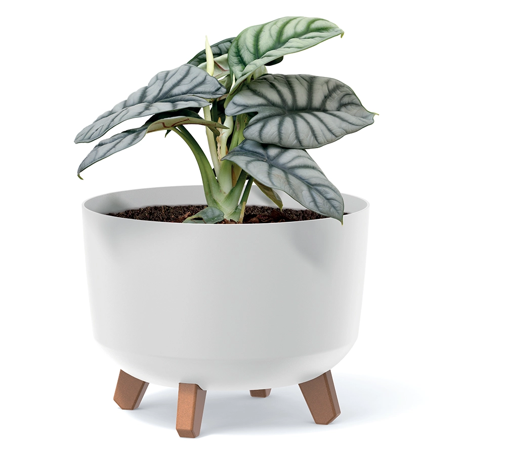 Piciorușele scurte cu decor de lemn ridică vasul de pe suprafață, favorizând circulația aerului și rădăcini mai sănătoase.