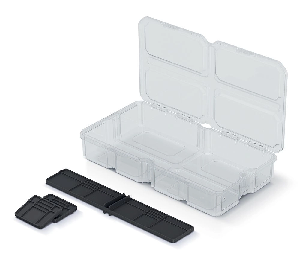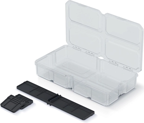 Organizatorul practic MSX BOX, în variantă transparentă, oferă o vedere rapidă asupra conținutului datorită capacului transparent și permite aranjare flexibilă cu ajutorul celor 3 separatoare detașabile. Este ușor de transportat, fabricat din plastic rezistent și ideal pentru depozitarea pieselor mici, a șuruburilor sau cuielor.