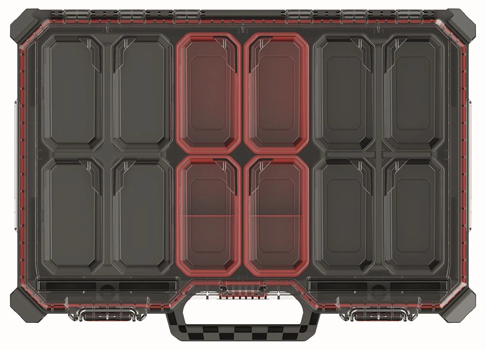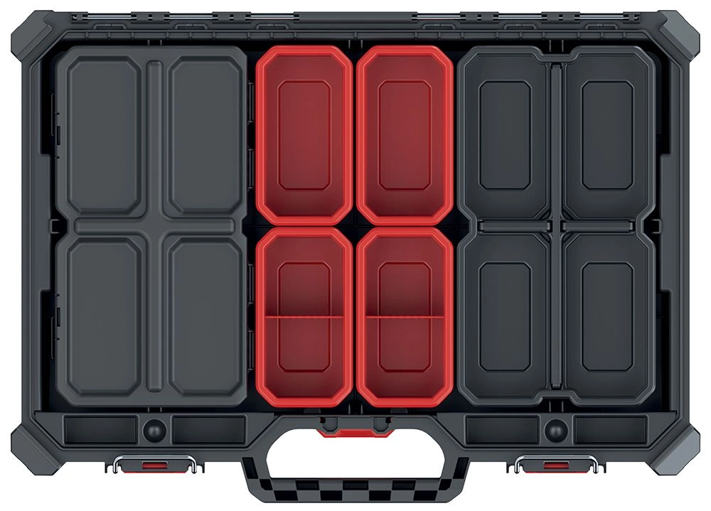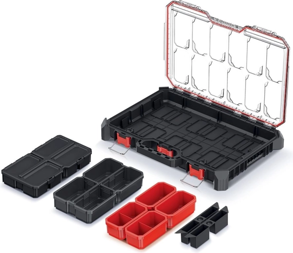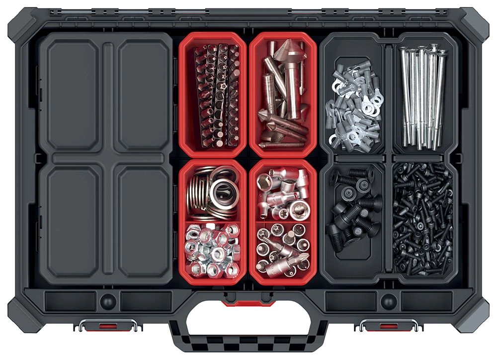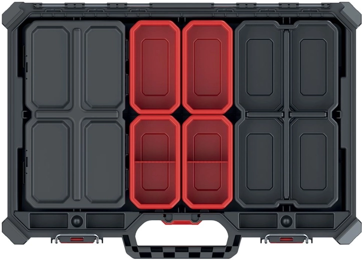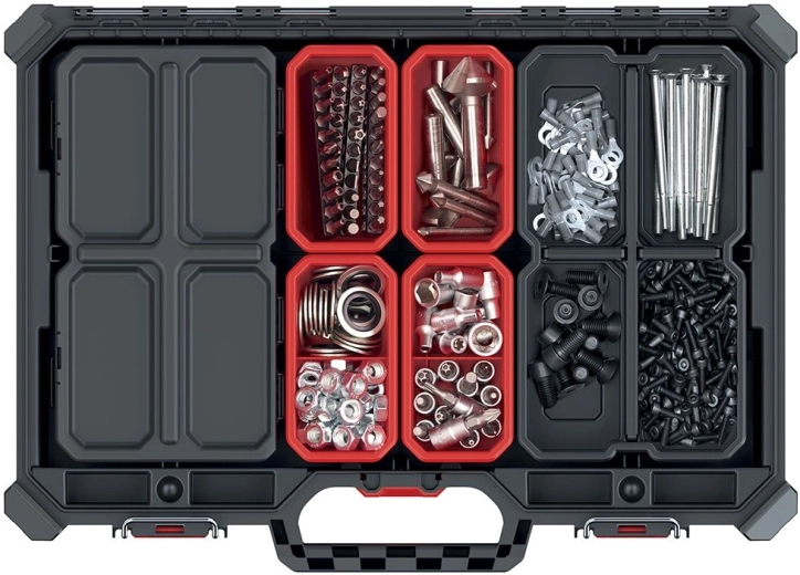 Datorită celor 7 cutii detașabile și celor 3 separatoare, vă adaptați cu ușurință interiorul la nevoile curente. Balamalele metalice și clemele din ABS cu inserții metalice mențin capacul bine închis, în timp ce etanșarea împotriva prafului și apei protejează conținutul în timpul transportului și lucrului în medii prăfoase sau umede. Organizatorul poate fi interconectat în sistemul X BLOCK prin mecanismul de blocare, pentru stivuire și transport comode.