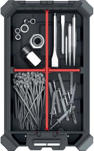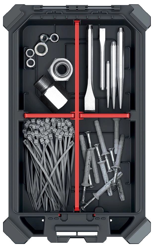 Despărțitoarele detașabile permit schimbarea rapidă a aranjării compartimentelor în funcție de dimensiunea șuruburilor, diblurilor sau biților.