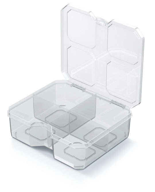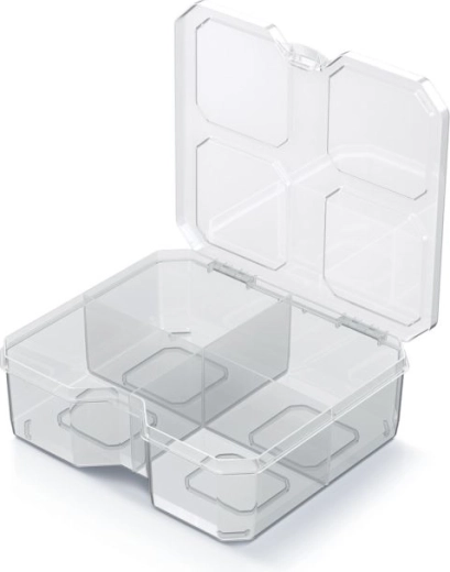 Organizatorul practic SQR box, cu dimensiunile 15,6 × 14 × 5 cm, oferă depozitare ordonată pentru mărunțișuri în locuință, birou sau atelier. Datorită designului transparent, găsești rapid ceea ce ai nevoie, fără a deschide cutia. Patru compartimente solide și pereți despărțitori rezistenți păstrează șuruburile, agrafele și alte mici obiecte în siguranță la locul lor, în timp ce carcasa ușoară din plastic facilitează manipularea și transportul.