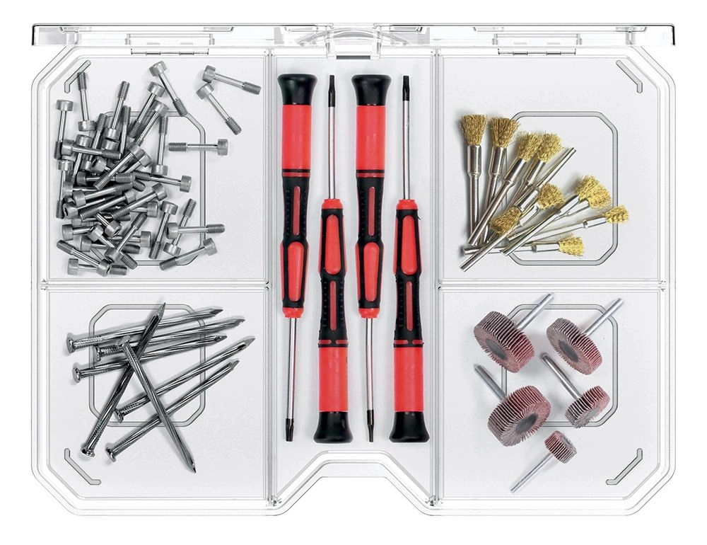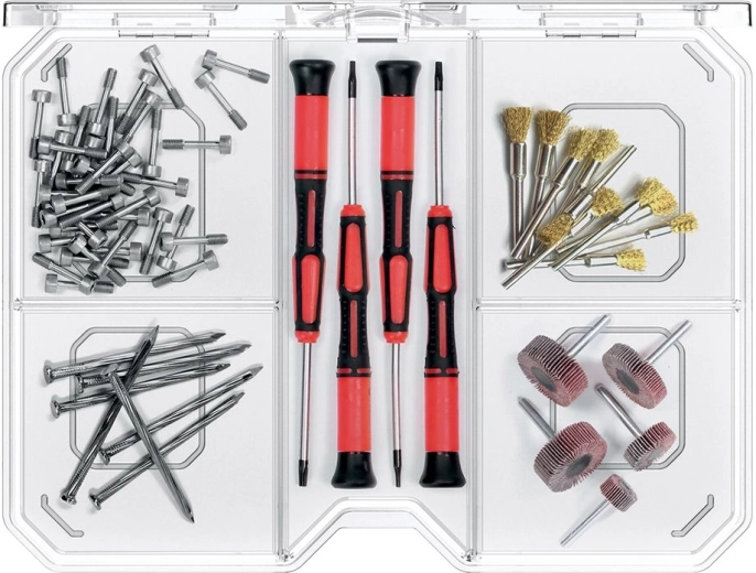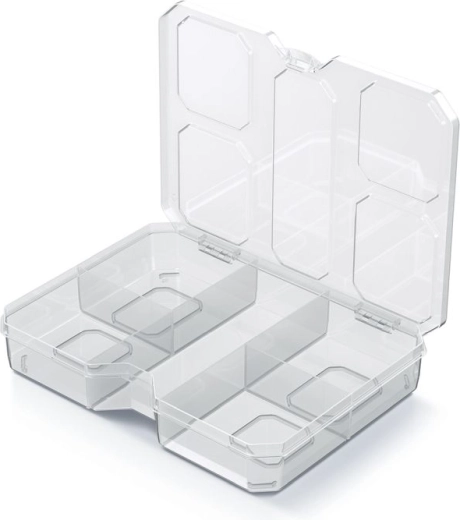 Păstrați ordinea în mărunțișuri cu acest organizator compact, care încape ușor pe raft, în sertar sau în trusa de scule. Execuția transparentă vă permite să vedeți instant conținutul, economisind timp când căutați piesa potrivită.
