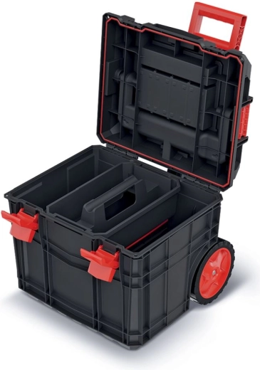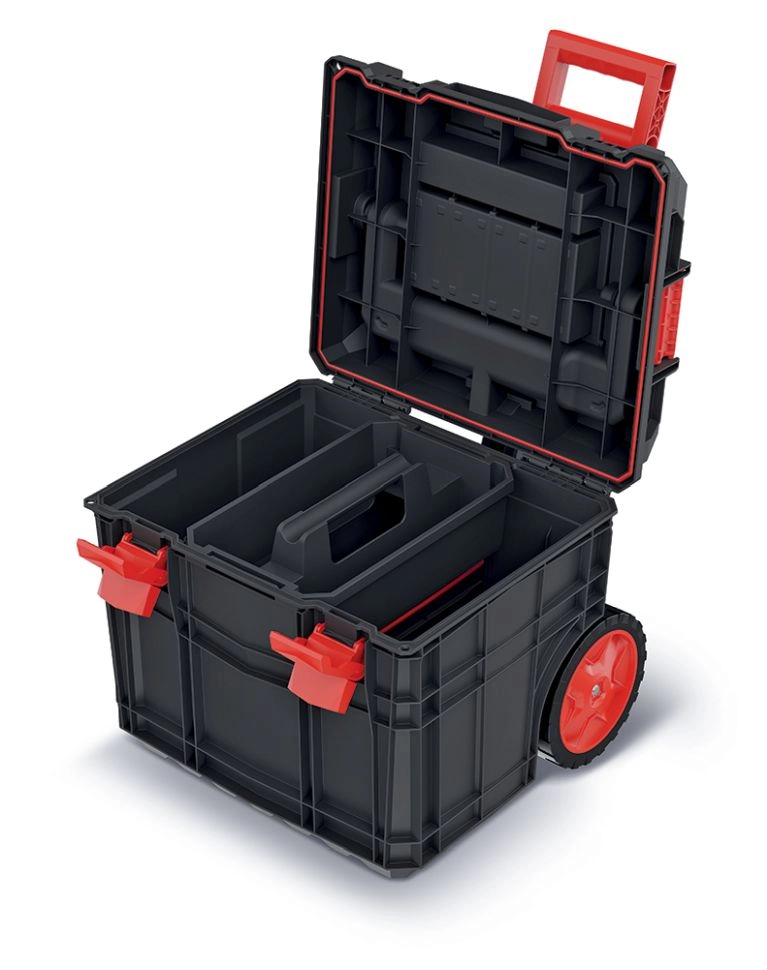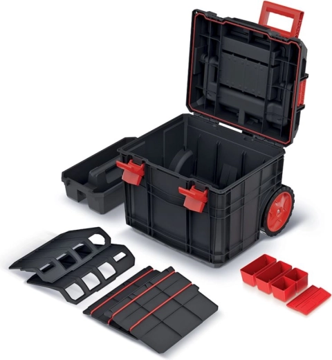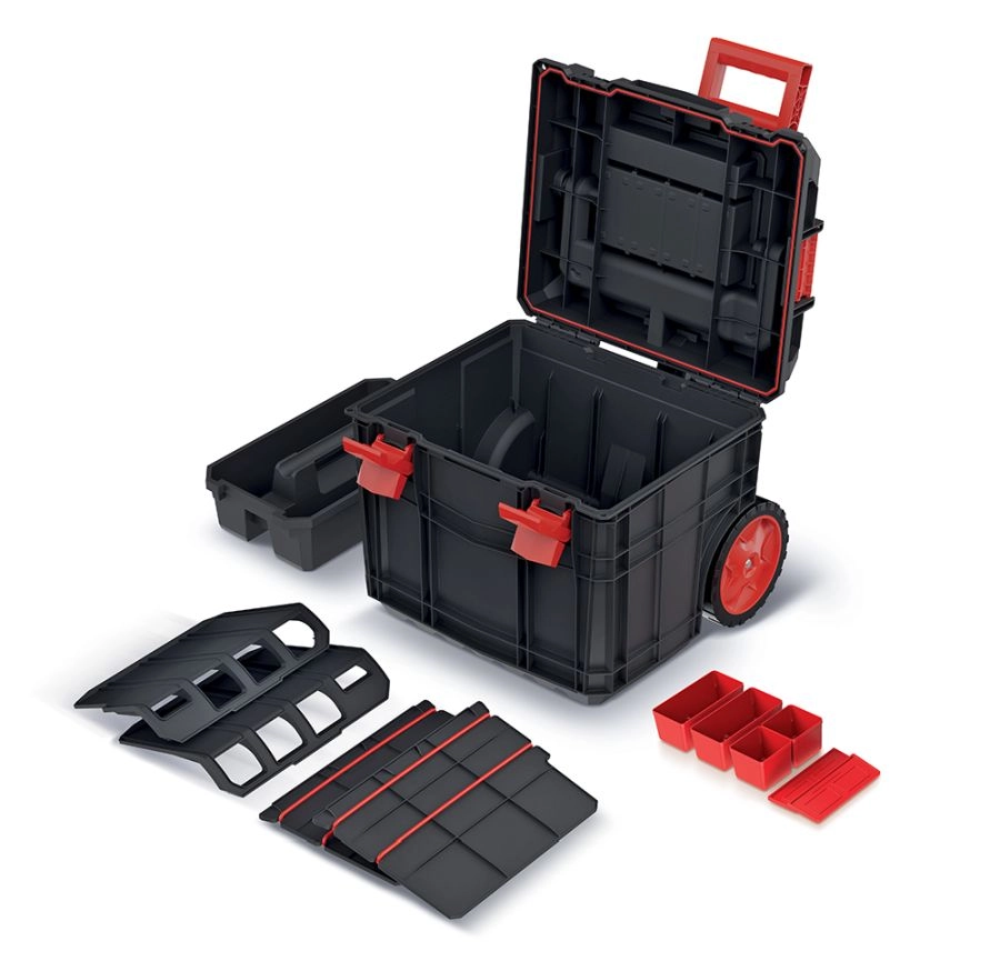 Două compartimente detașabile, cutiuțe mici și suporturi pentru scule păstrează totul aranjat clar. Îți poți adapta ușor spațiul în funcție de nevoile curente.