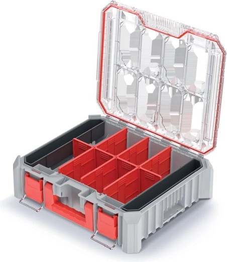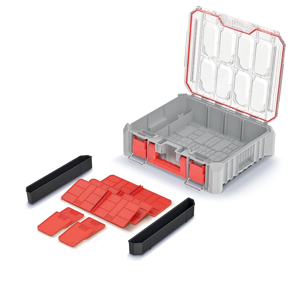 Două recipiente detașabile și șapte despărțitoare amovibile oferă o compartimentare flexibilă, modulară. Etanșarea solidă protejează conținutul împotriva prafului și umidității, astfel încât organizatorul este ideal atât pentru atelier, cât și pentru lucrări pe teren. Clemele metalice/rezistente și mânerul robust asigură transportul în siguranță.
