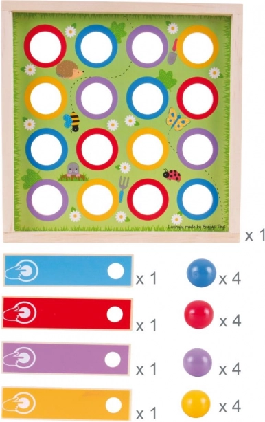 Joc de familie distractiv pentru copii de la 3 ani, care dezvoltă motricitatea fină, spiritul de observație și coordonarea mână–ochi. Scopul este să lansezi bilele colorate în orificiile corespunzătoare de pe planșă folosind lansatoarele. Joc pentru 2–4 jucători, în culorile roșu, albastru, galben și mov. Fabricat din lemn obținut responsabil și conform normelor europene de siguranță.