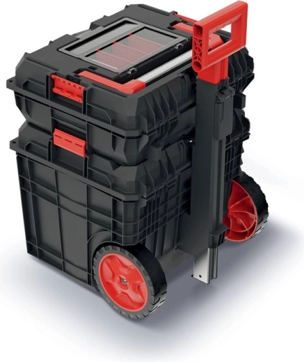 Set practic de două cutii pentru scule pentru organizare clară și transport sigur. Cutia mai mică oferă un organizator transparent pentru mărunțișuri, iar cutia mai mare, cu roți și tăviță adâncă, găzduiește scule voluminoase. Construcție din plastic rezistent, sistem de închidere cu cheie și etanșare compactă care protejează conținutul împotriva prafului și umezelii.