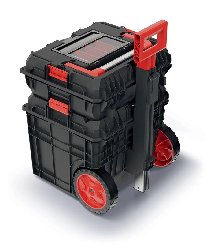 Ambele cutii sunt din plastic solid, de culoare neagră, și dispun de sistem de închidere cu cheie, etanșare compactă și închizători din ABS, care asigură protecție împotriva prafului și umezelii chiar și în timpul transportului. Datorită roților integrate ale cutiei mai mari, mutarea sculelor este rapidă și comodă chiar și pe distanțe mai lungi.