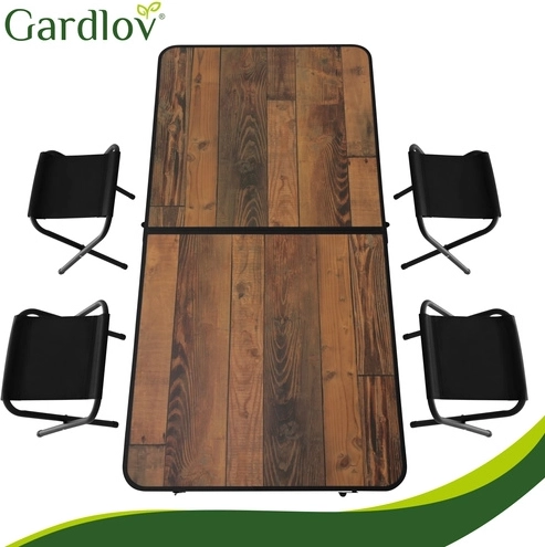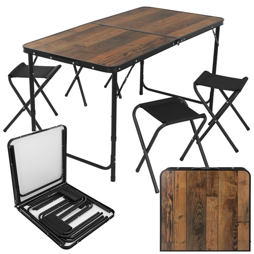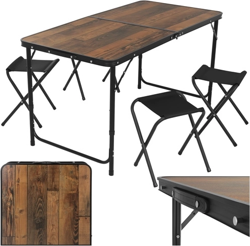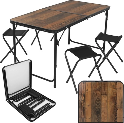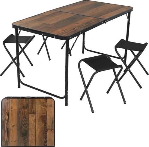 Întregul set se pliază într-o carcasă compactă cu mâner. În interior încap și taburetele, astfel împachetați rapid și fără dezordine.