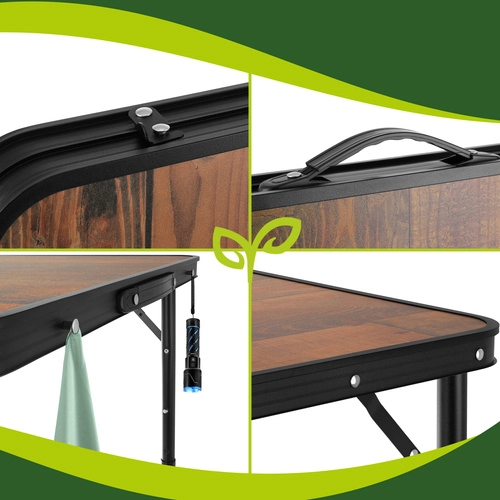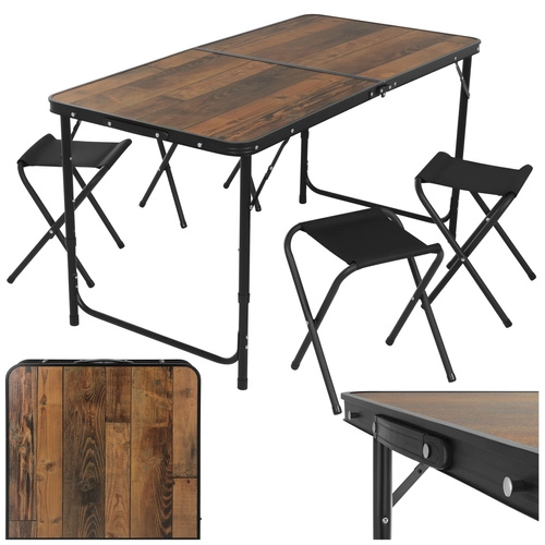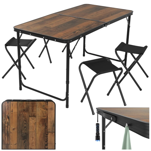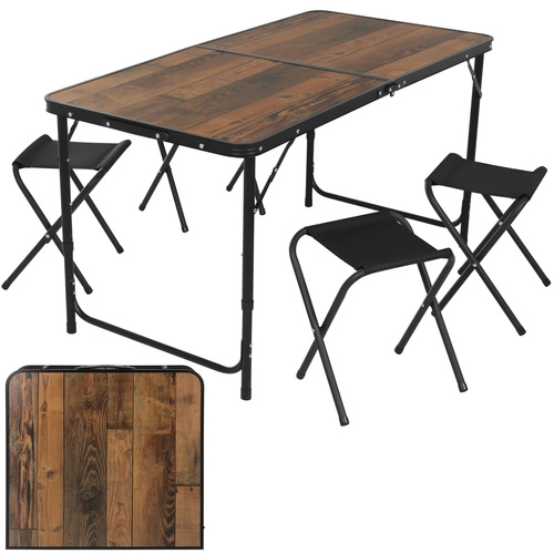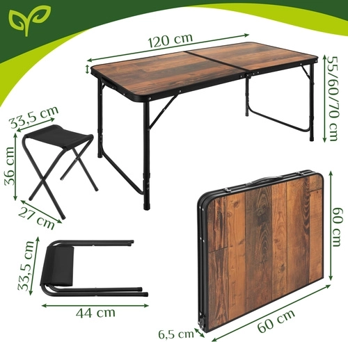 Masa oferă 3 niveluri de reglare a înălțimii, astfel încât o adaptați ușor pentru servirea mesei, cafea sau lucru pe teren. Cele patru taburete pliabile, ușoare, asigură ședere confortabilă pentru 4 persoane și, după utilizare, încap în interiorul mesei pliate pentru depozitare și transport cât mai economice.