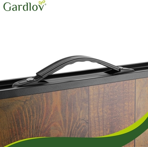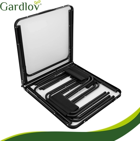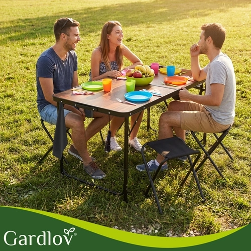 Setul practic pliabil GARDLOV combină o masă de grădină cu înălțime reglabilă și 4 taburete pliabile într-un singur produs. După pliere, se transformă într-un troller compact cu mâner, ușor de transportat și depozitat. Construcția rezistentă, ramele metalice stabile și capetele antiderapante asigură o masă confortabilă în grădină, pe terasă sau la camping.