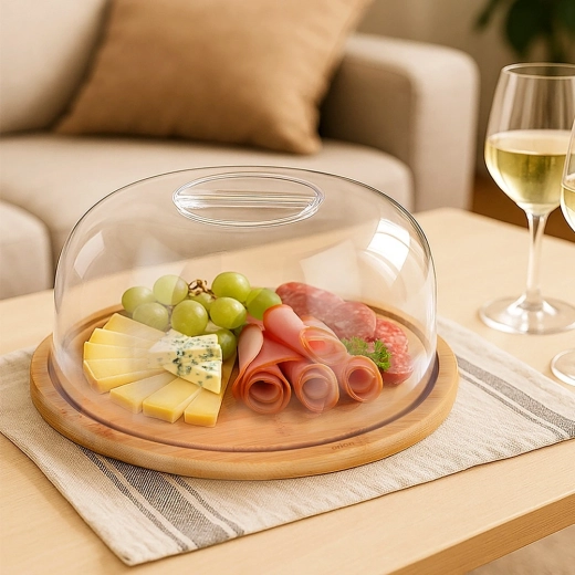 Platou rotund, stilat, din bambus natural, cu capac clar, perfect pentru servirea zilnică și pentru ocazii speciale. Datorită canalului circular integrat, capacul se fixează în siguranță, menținând totul protejat. Capacul transparent, cu mâner practic, permite ridicarea ușoară și o prezentare elegantă a brânzeturilor, mezelurilor, fructelor și deserturilor.