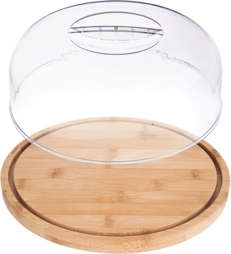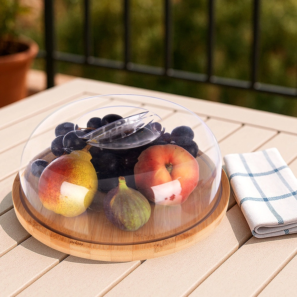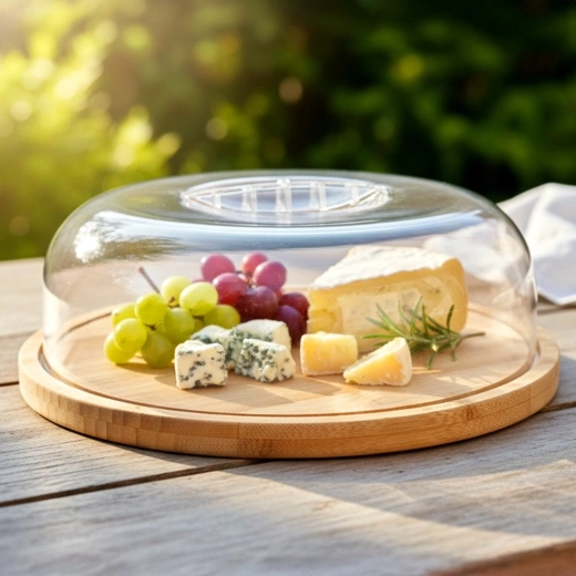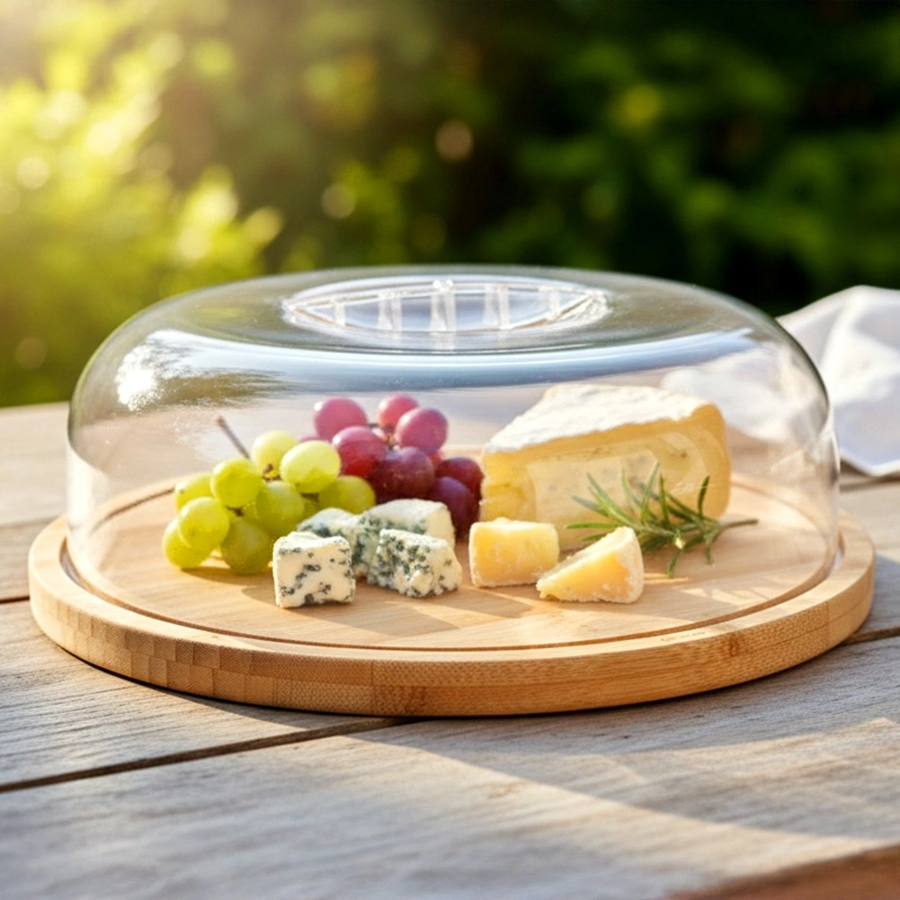 Elegantul toc de servire din bambus cu capac transparent, cu diametrul de 26 cm, este ideal pentru servirea brânzeturilor, deserturilor și gustărilor. Protejează alimentele de praf și insecte, le menține proaspete mai mult timp și, datorită lemnului de bambus rezistent, oferă o prezentare stabilă și stilată atât pe masă, cât și în grădină.
