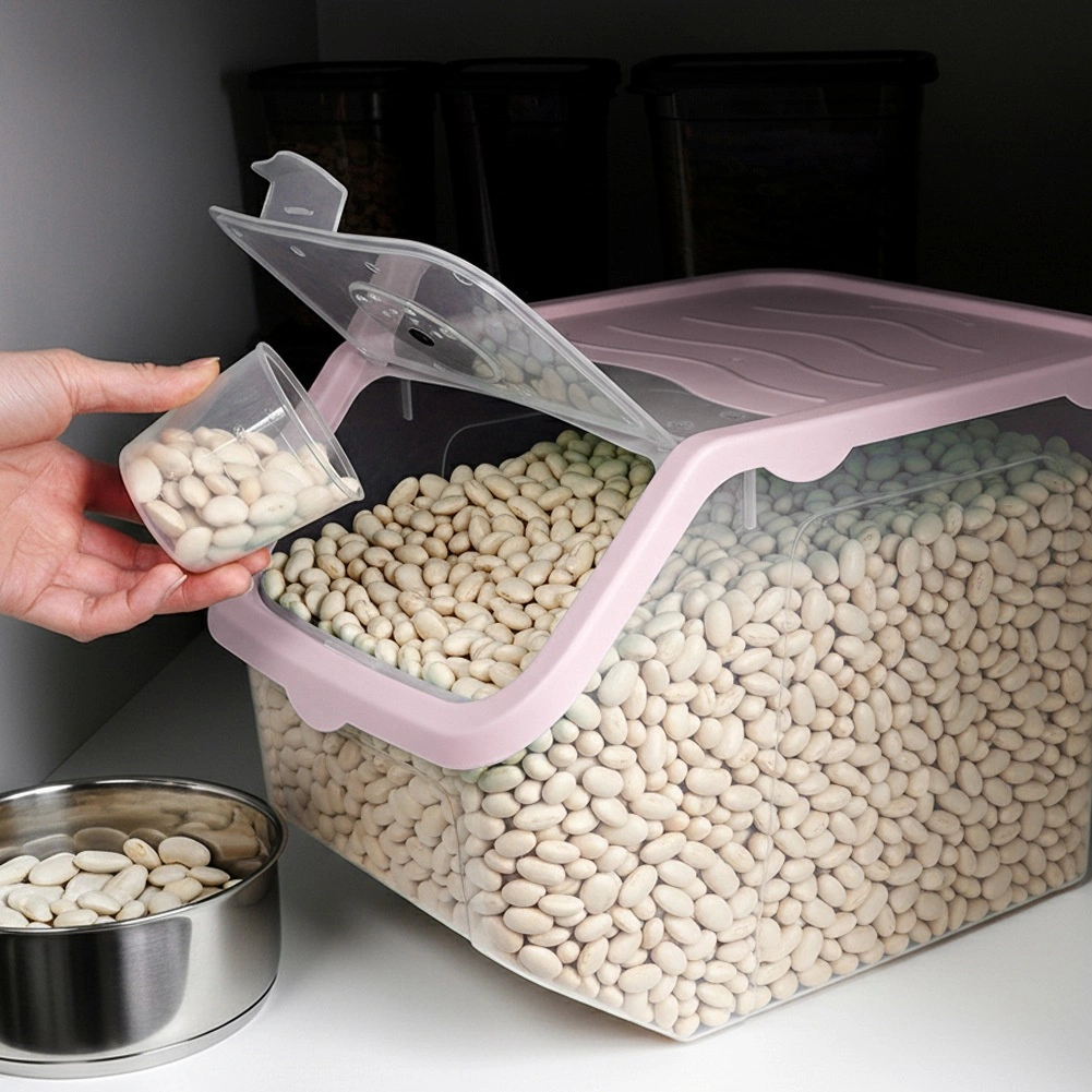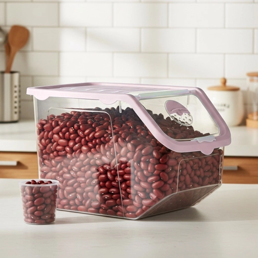 Ușița rabatabilă cu mâner permite preluarea cantității necesare fără a scoate capacul. Ideală pentru utilizare zilnică și menținerea ordinii în cămară.