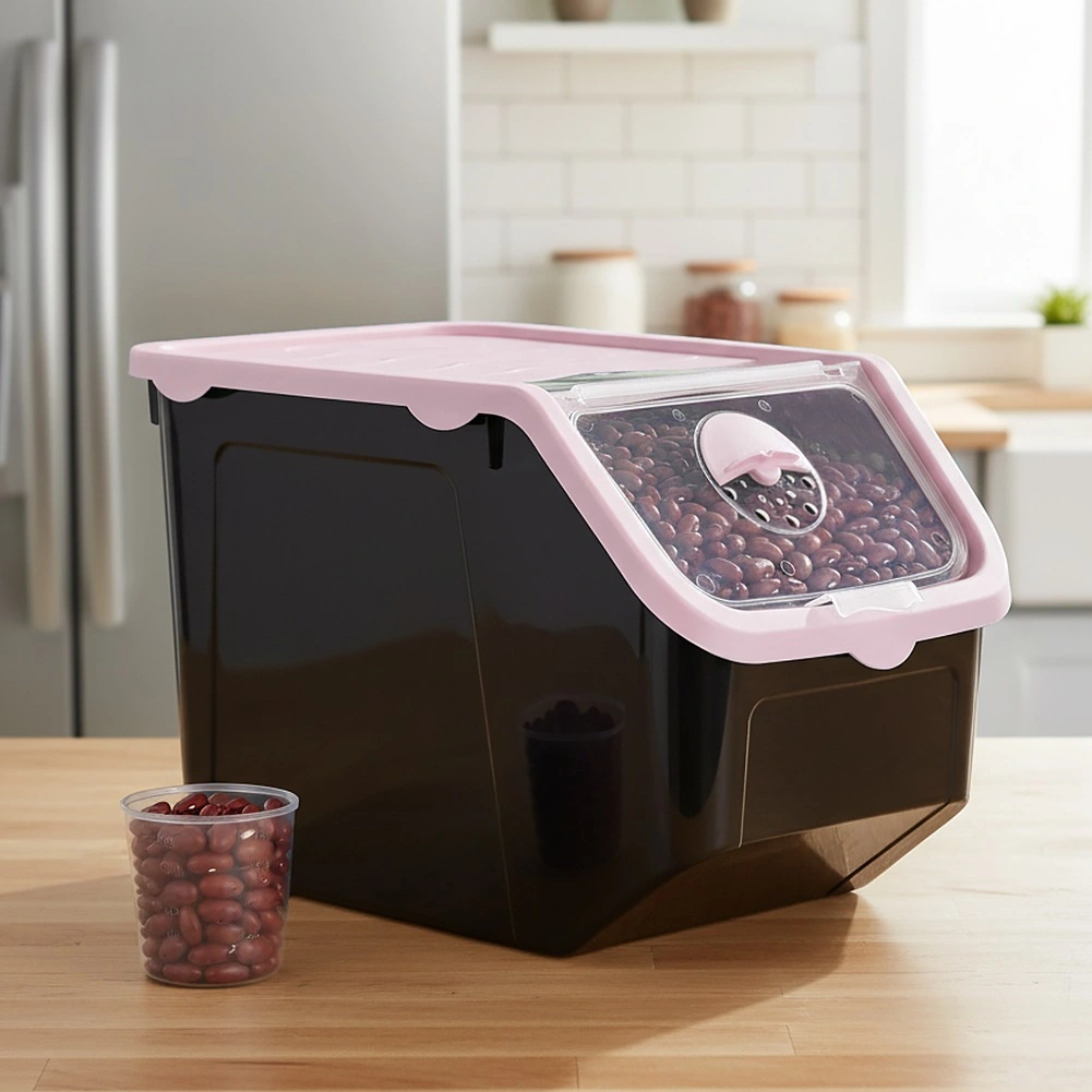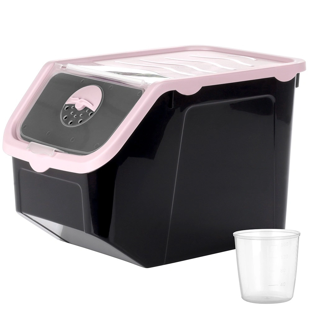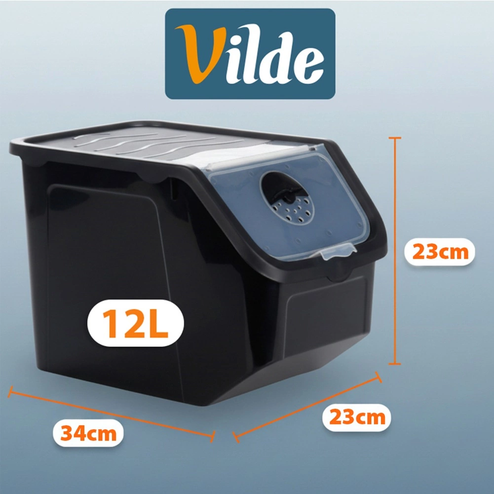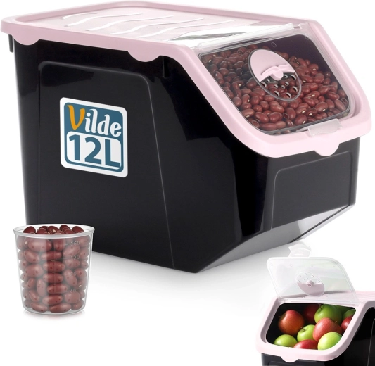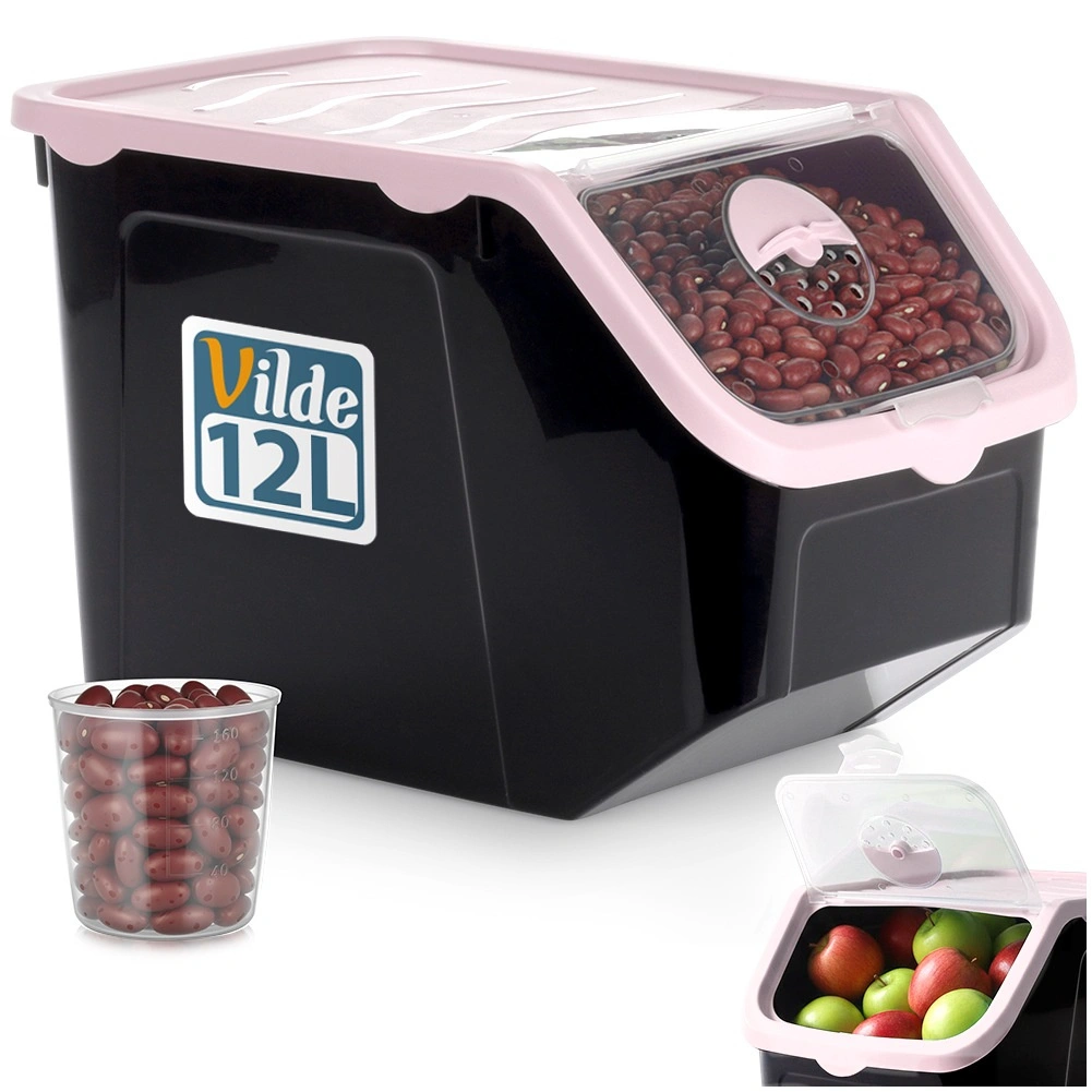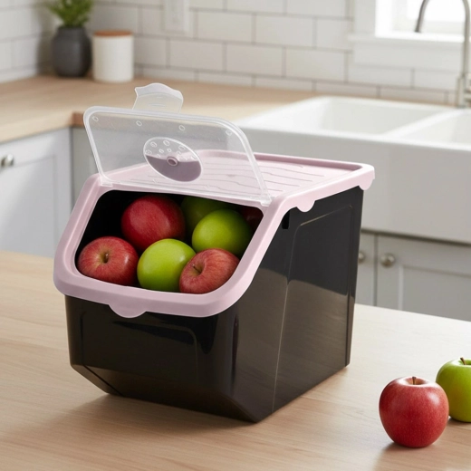 Container practic din plastic rezistent, de culoare neagră cu capac roz, ideal pentru depozitarea cepei, cartofilor, usturoiului, fructelor și a alimentelor vrac (leguminoase, hrană, pulberi). Clapeta frontală transparentă permite verificarea rapidă a conținutului și dozarea comodă; capacul poate fi întredeschis sau îndepărtat complet. Materialul este sigur pentru alimente, nu conține BPA și rezistă la temperaturi între -20 °C și 100 °C.
