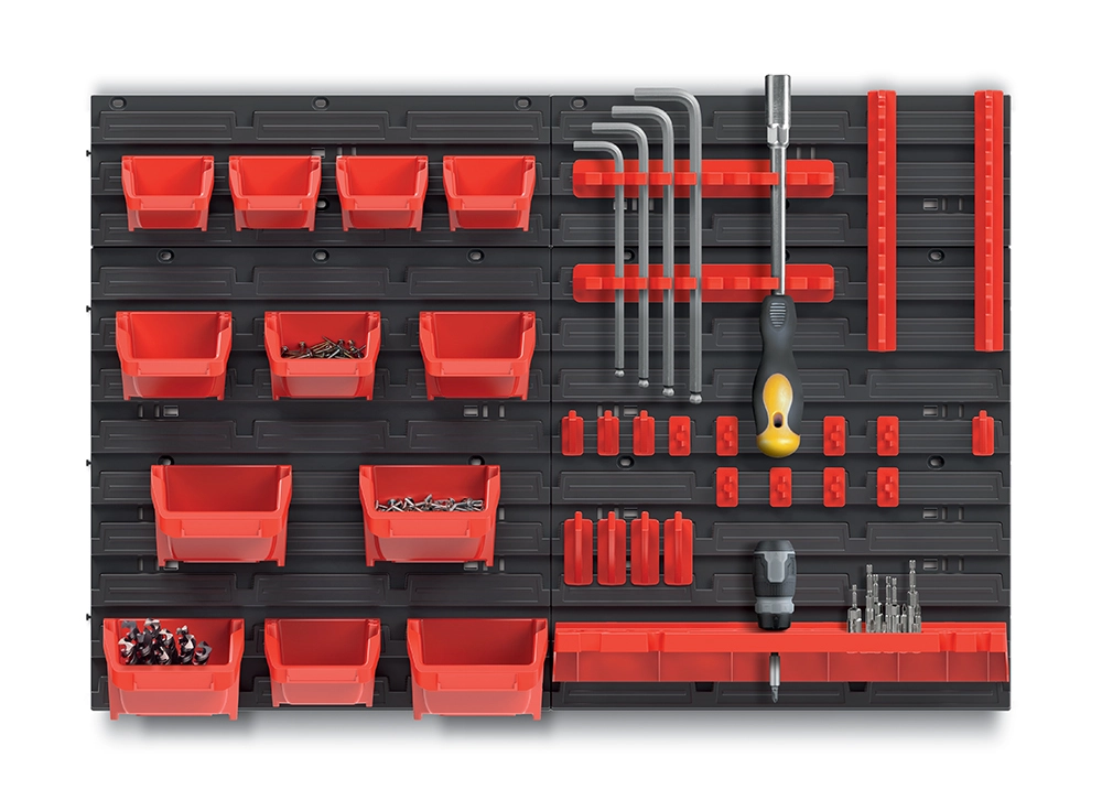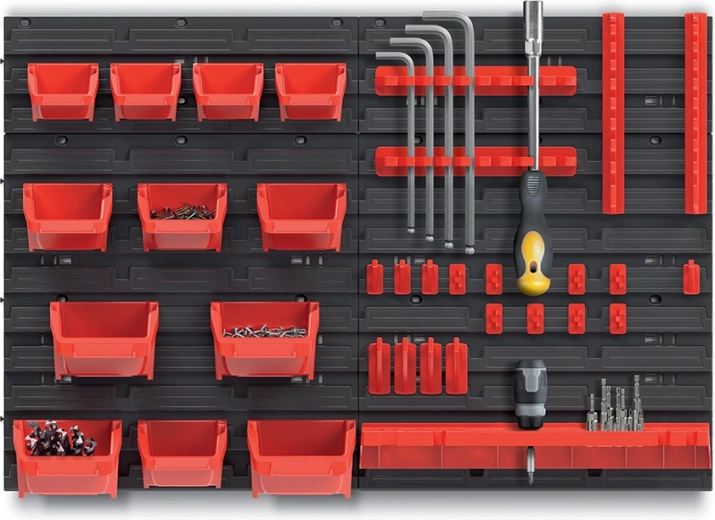 Obțineți ordine în unelte și materialele de fixare datorită sistemului suspendat care combină panou, cutii, cârlige și poliță într-un ansamblu funcțional. Plasticul rezistent, în eleganta combinație negru-roșu, asigură durabilitate și întreținere ușoară, în timp ce accesoriile bine gândite permit acces rapid la tot ce aveți nevoie în timpul lucrului.