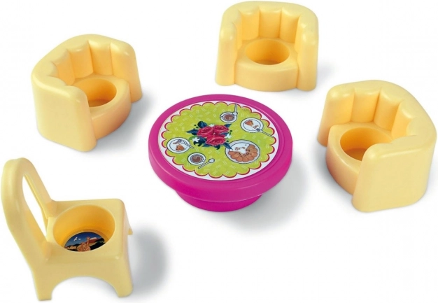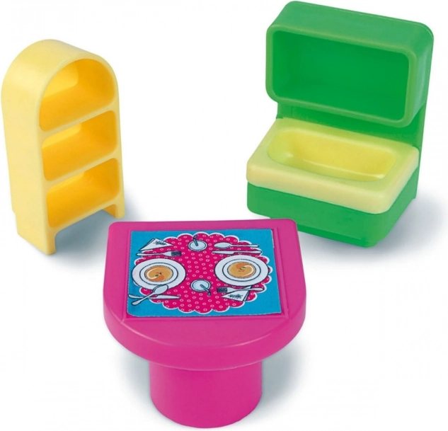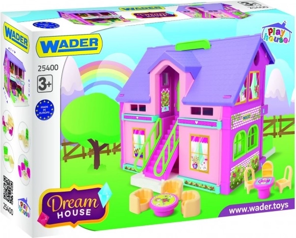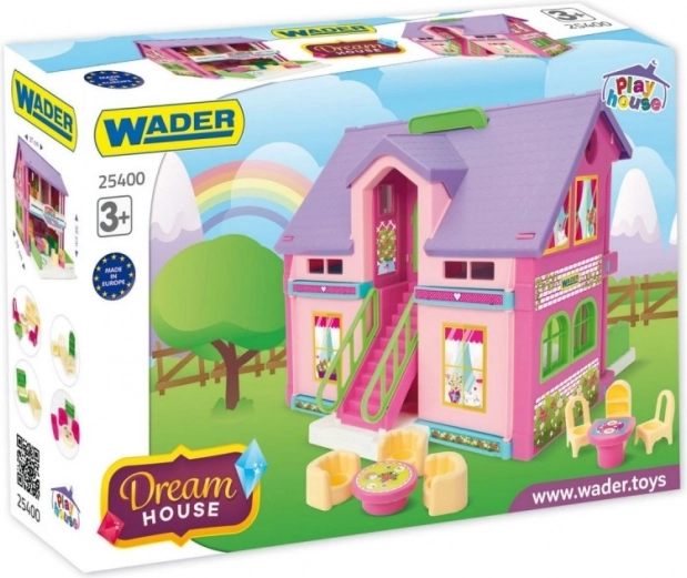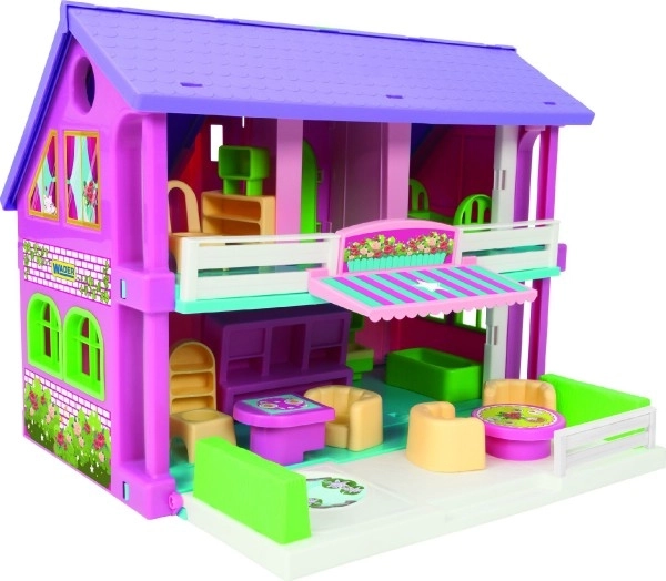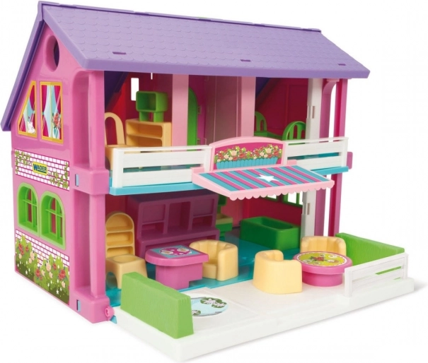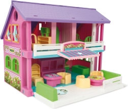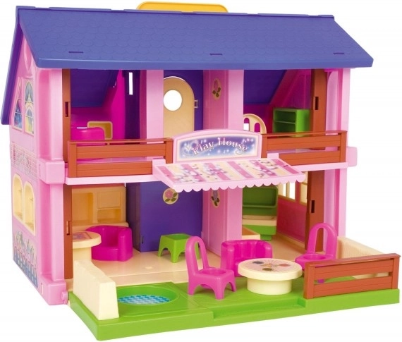 Eleganta căsuță roz pentru păpuși din seria Play House oferă copiilor un spațiu variat de joacă – de la terasă și living, la bucătărie și cămăruțele de la etaj. Ferestrele și ușile care se deschid, precum și scările, fac jocul mai realist, iar cele 14 piese de mobilier cu autocolante decorative permit finisarea interiorului până la ultimul detaliu.