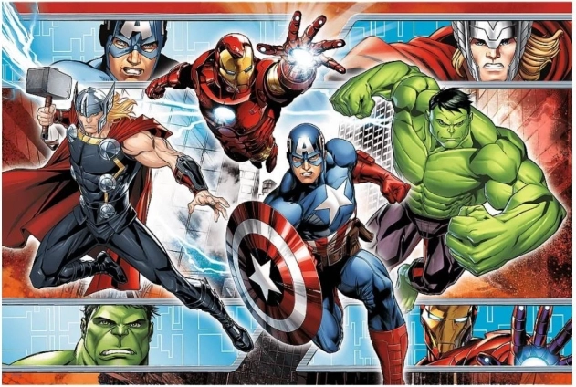 Puzzle-ul prezintă personaje îndrăgite din Avengers precum Thor, Iron Man, Captain America și Hulk.