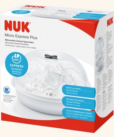 NUK Micro Express Plus este un sterilizator cu abur pentru cuptorul cu microunde, care asigură dezinfectarea fiabilă a biberoanelor și accesoriilor pentru bebeluși în câteva minute. Datorită suportului inteligent, poate găzdui până la 4 biberoane de 300 ml cu gât larg și le menține în poziția corectă pentru o uscare eficientă. Capacului transparent și noului sistem de blocare le datorează o utilizare sigură și clară.