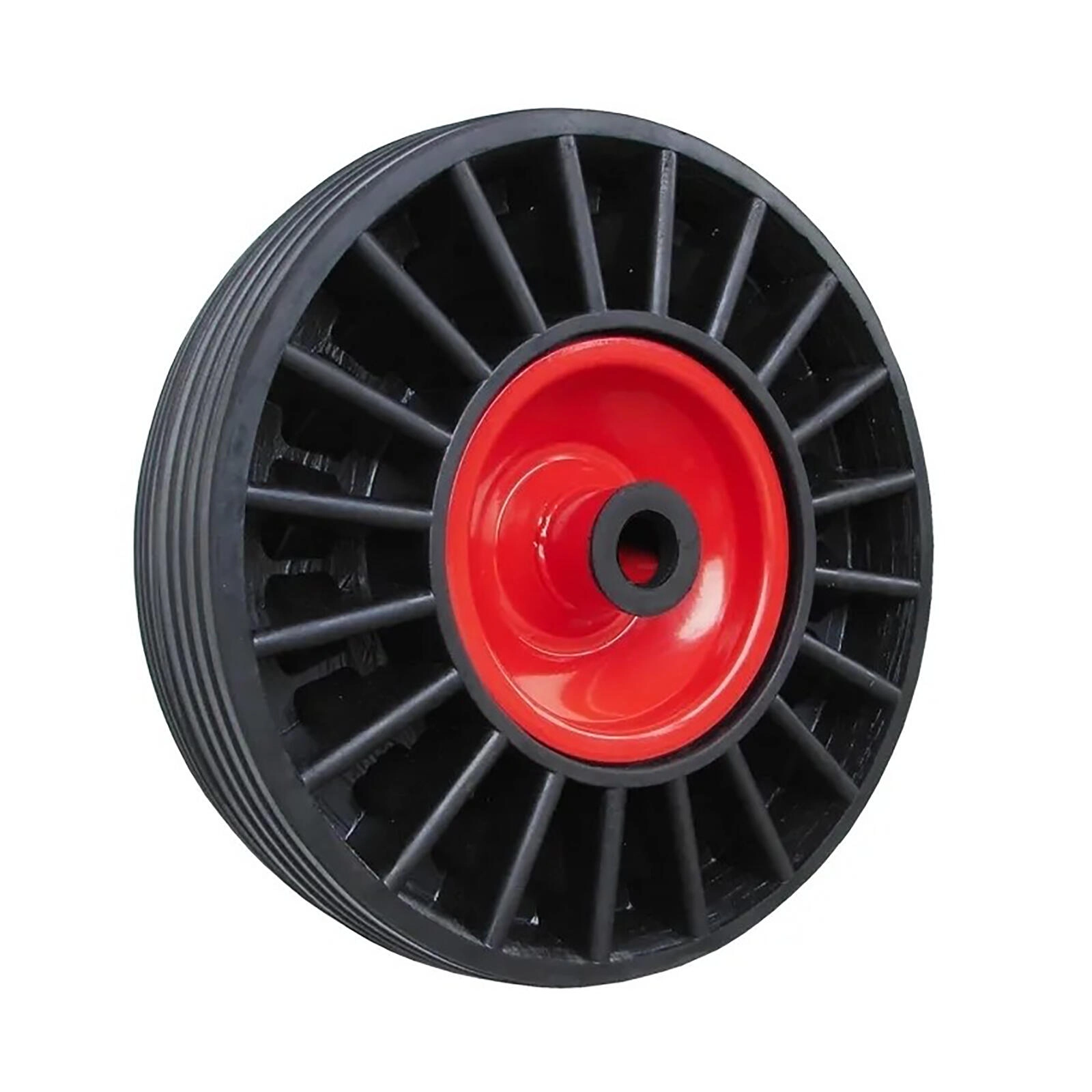 Roată plină robustă cu disc metalic, proiectată pentru durată de viață îndelungată și întreținere minimă. Datorită construcției pline, nu există risc de perforare sau pierdere a aerului, ceea ce asigură fiabilitate maximă în utilizarea zilnică.