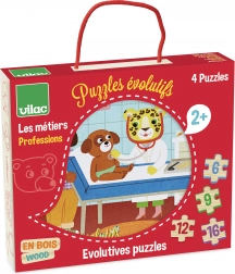 Acest set conține patru puzzle-uri evolutive cu motive din diverse profesii, concepute pentru a-i motiva pe copii să progreseze treptat. Datorită numărului diferit de piese, mânuțele celor mici își însușesc tehnicile corecte de asamblare și învață să recunoască formele și culorile.
