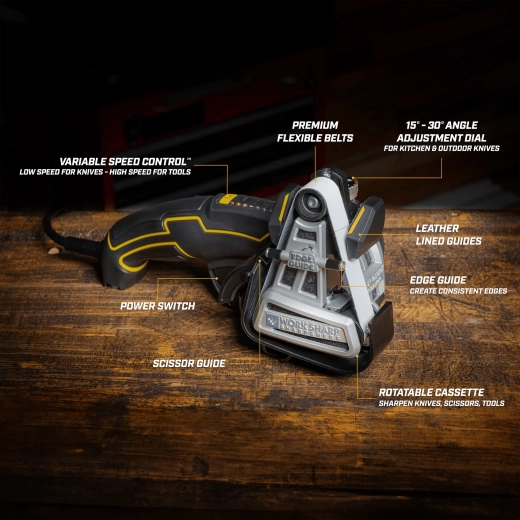 Polizor electric profesional pentru cuțite și unelte WORK SHARP Ken Onion Edition MK2 oferă ascuțire rapidă, precisă și consecventă datorită benzilor abrazive flexibile, ghidajelor de unghi ajustabile 15°–30° și motorului cu turație variabilă. Ideal pentru cuțite de bucătărie, outdoor și de buzunar, foarfece, topoare sau unelte de grădină.