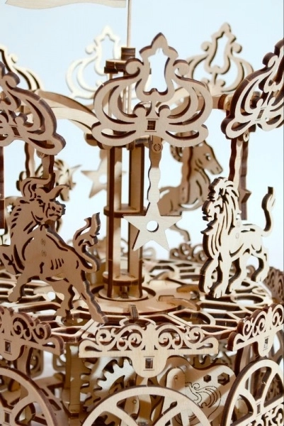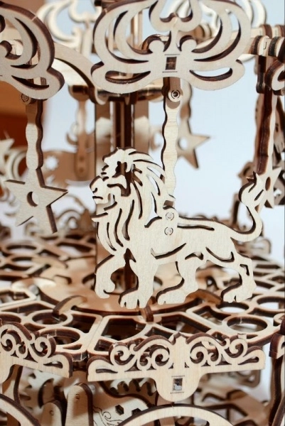Fiecare piesă este tăiată cu precizie pentru îmbinare lină și un aspect impresionant. Ornamentele și motivele animale accentuează estetica caruselului clasic.