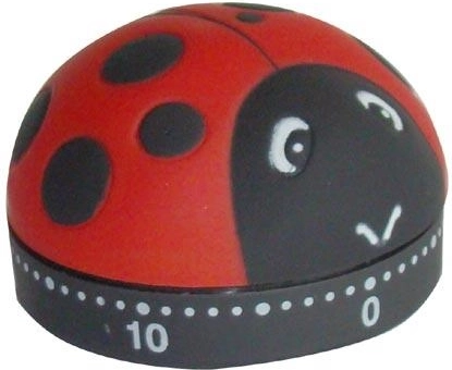 Un cronometru de bucătărie drăgălaș în formă de buburuză monitorizează timpul până la 60 de minute. Datorită mecanismului mecanic cu arc nu necesită baterii, este ușor, din plastic rezistent și este ideal pentru gătit, copt și alte activități.