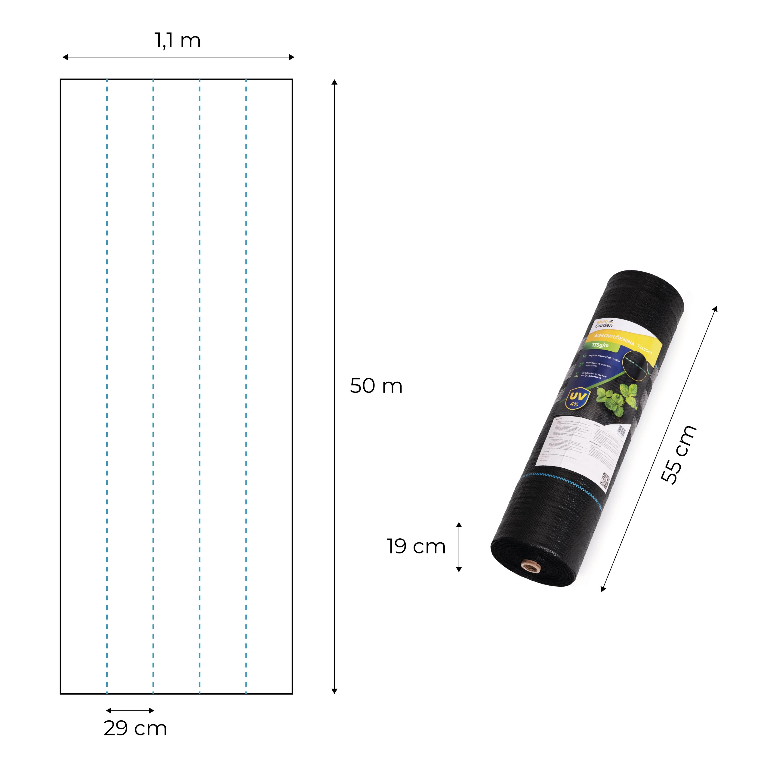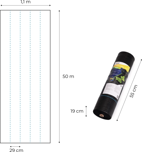 Păstrați grădina curată și fără chimicale. Acest agrotextil profesional pentru mulcire, cu țesătură densă, blochează lumina și astfel împiedică germinarea buruienilor, în timp ce permite trecerea apei și a aerului către rădăcini. Liniile de ghidaj albastre la fiecare 29 cm facilitează organizarea precisă a plantărilor pentru un rezultat estetic și ordonat.