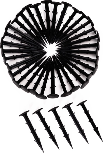 Pachetul conține 50 de țăruși din plastic (10 cm) pentru ancorarea rapidă și stabilă a textilei, împotriva deplasării și a vântului.