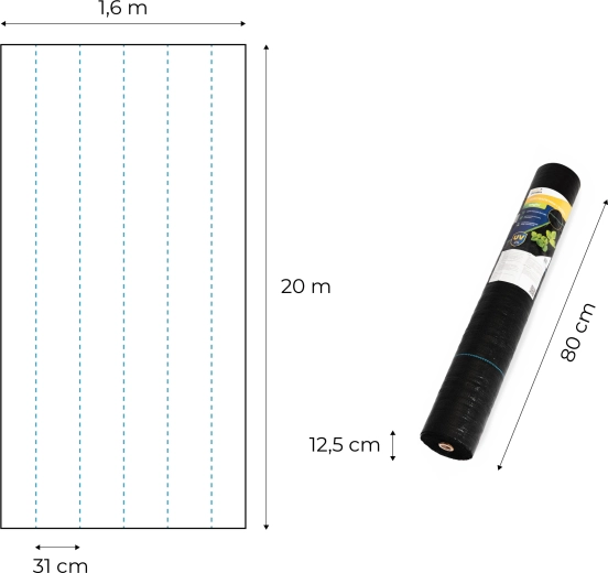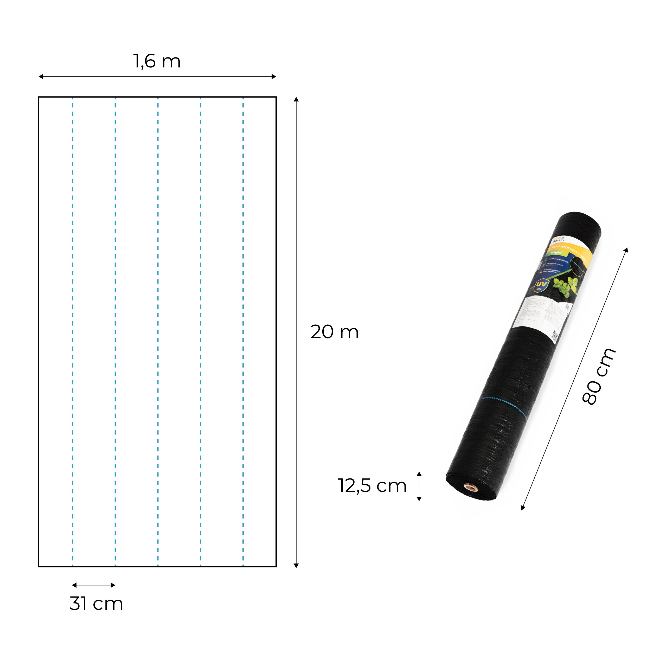 Textil agricol fiabil pentru straturi, tuia și arbuști, cu țesătură densă de 150 g/m², care blochează eficient lumina și creșterea buruienilor, permițând totodată trecerea apei și a aerului. Rezistent la radiații UV și intemperii, cu linii de ghidaj albastre pentru plantare precisă. Pachetul include 50 de țăruși de fixare pentru o instalare rapidă și stabilă.