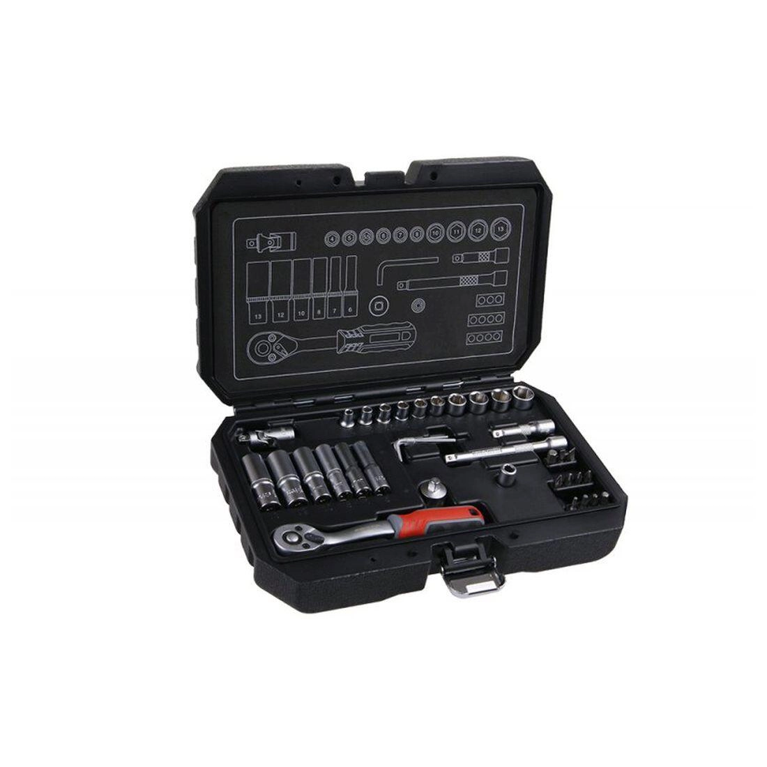 Setul compact de chei tubulare 1/4" de la FESTA oferă 36 de piese prelucrate cu precizie din oțel crom-vanadiu cu finisaj nichelat. Cliquetul cu mecanism fin, 72 de dinți și mâner ergonomic din cauciuc nepericulos asigură lucru confortabil și sigur. Ideal pentru atelierul de acasă și profesioniști, livrat într-o valiză robustă din plastic cu garanție de 10 ani.