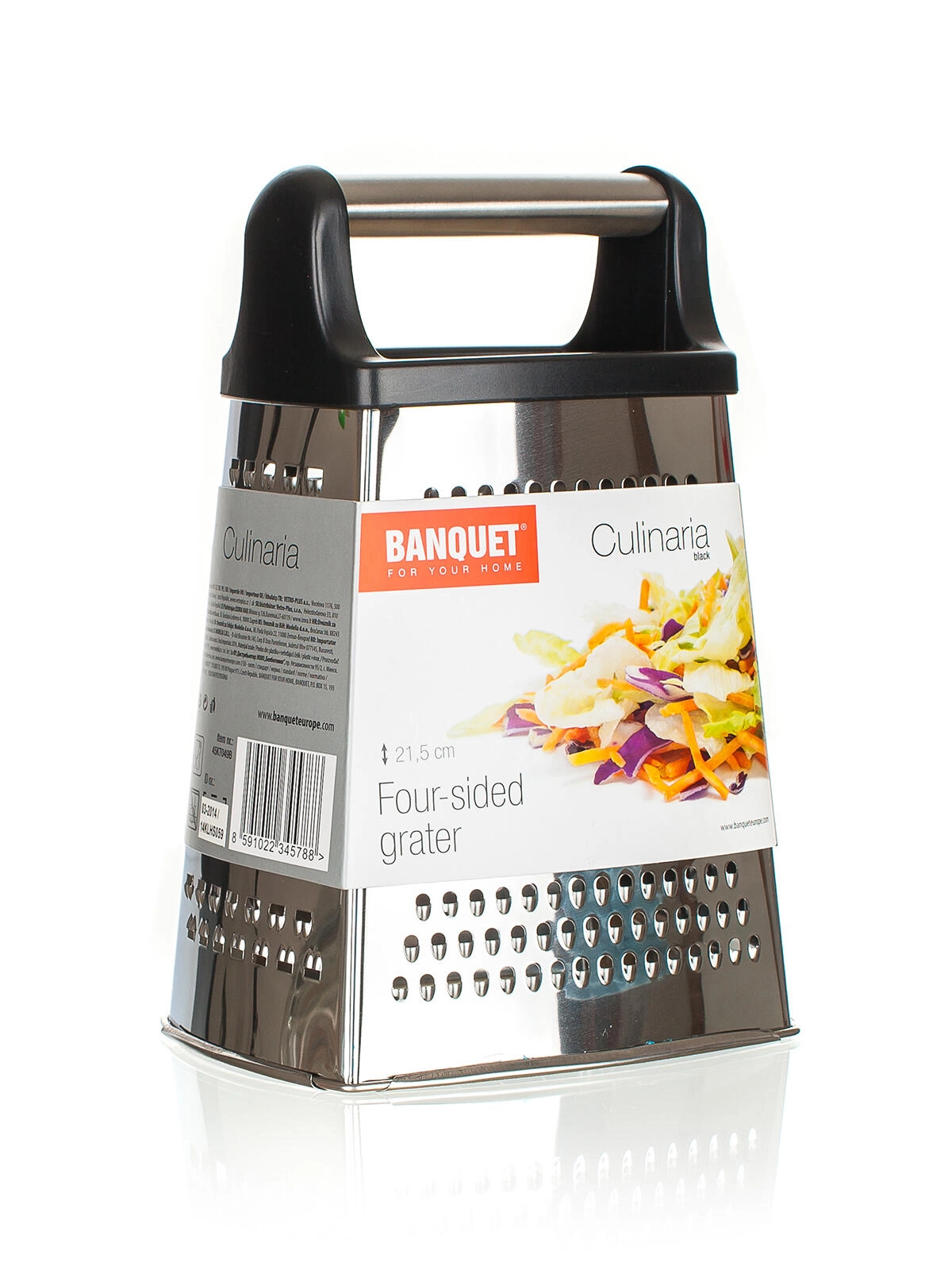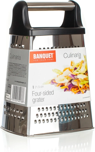 Răzătoarea de bucătărie universală CULINARIA combină pereți robuști din inox și un mâner ergonomic din plastic pentru o prindere sigură și stabilă. Datorită celor patru fețe funcționale, alegeți cu ușurință gradul potrivit de finețe pentru răzuire fină, răzuire grosieră, feliere sau fulgi decorativi.