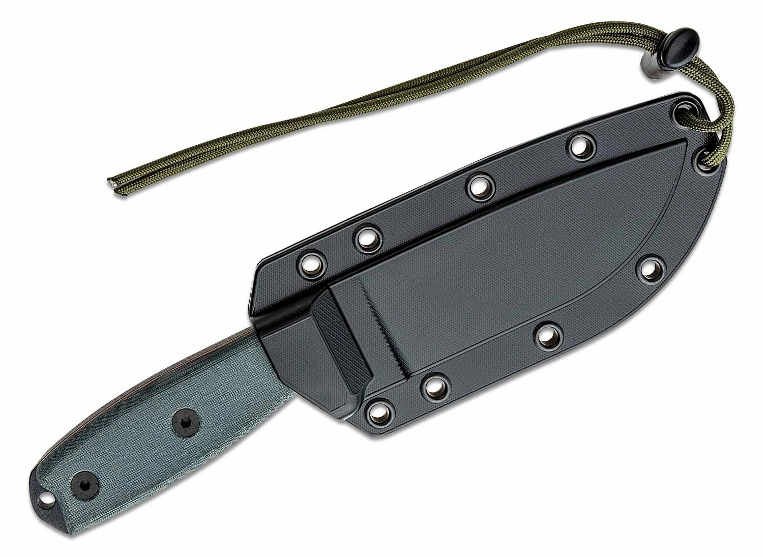 Mânerul din Micarta, de culoare gri, se potrivește perfect în mână, asigură o prindere fermă chiar și în condiții dificile și are la capăt un orificiu pentru șnur. Pachetul include o teacă din plastic negru cu posibilitate de prindere pe echipament, astfel încât să aveți cuțitul mereu în siguranță și la îndemână.