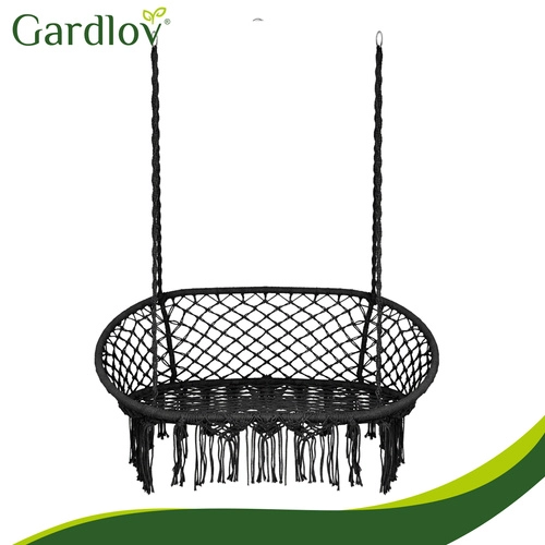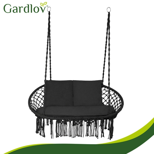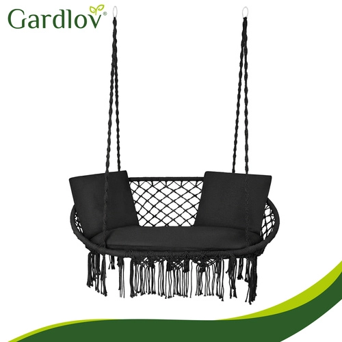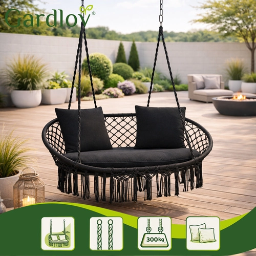 Scaunul hamac GARDLOV transformă zona ta de relaxare, exterioară sau interioară, într-un loc primitor pentru odihnă. Șezutul dublu cu perne moi susține plăcut spatele și permite o poziție confortabilă de ședere sau semi-întins, în timp ce franjurile macramé decorative oferă un aspect boho modern.