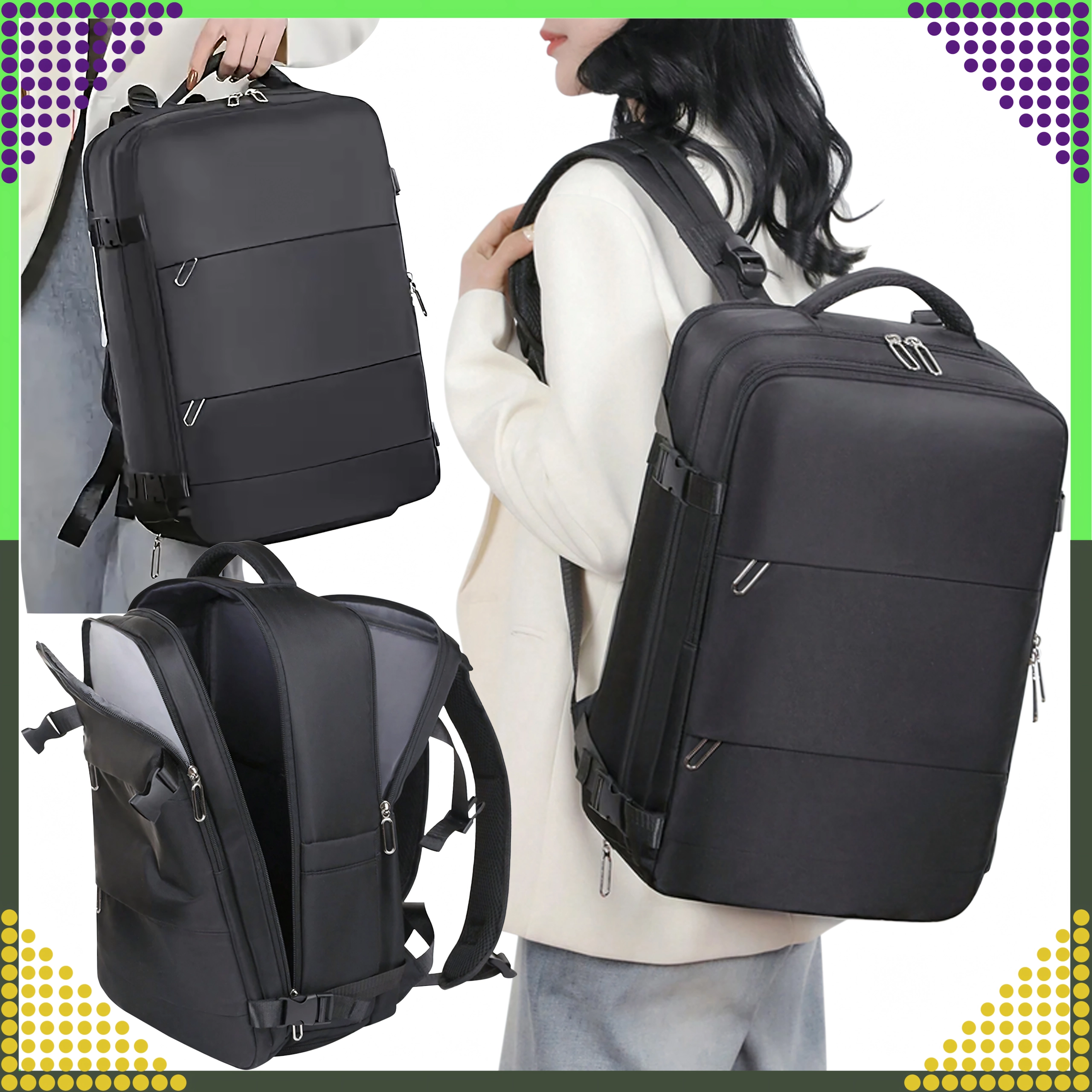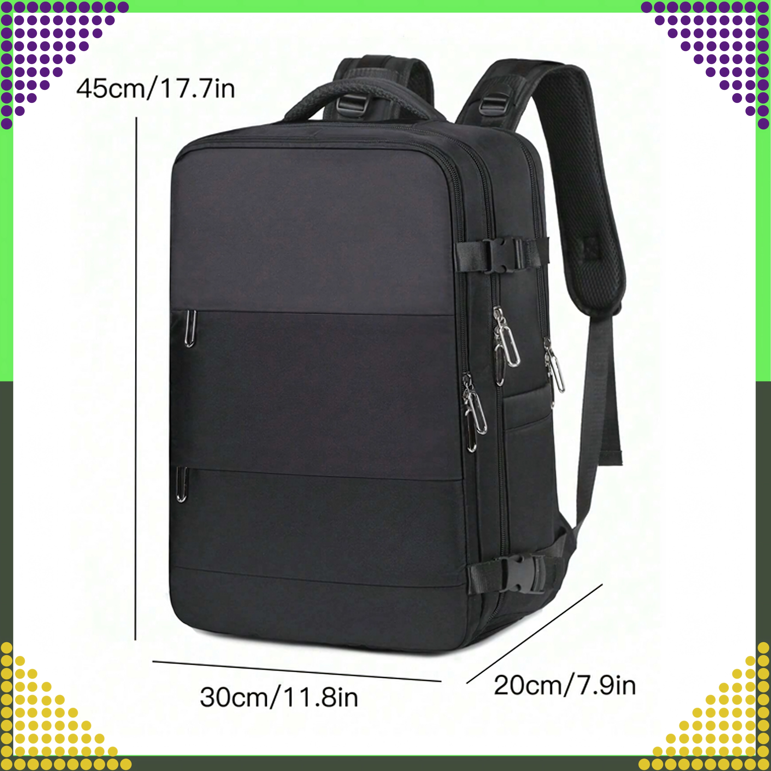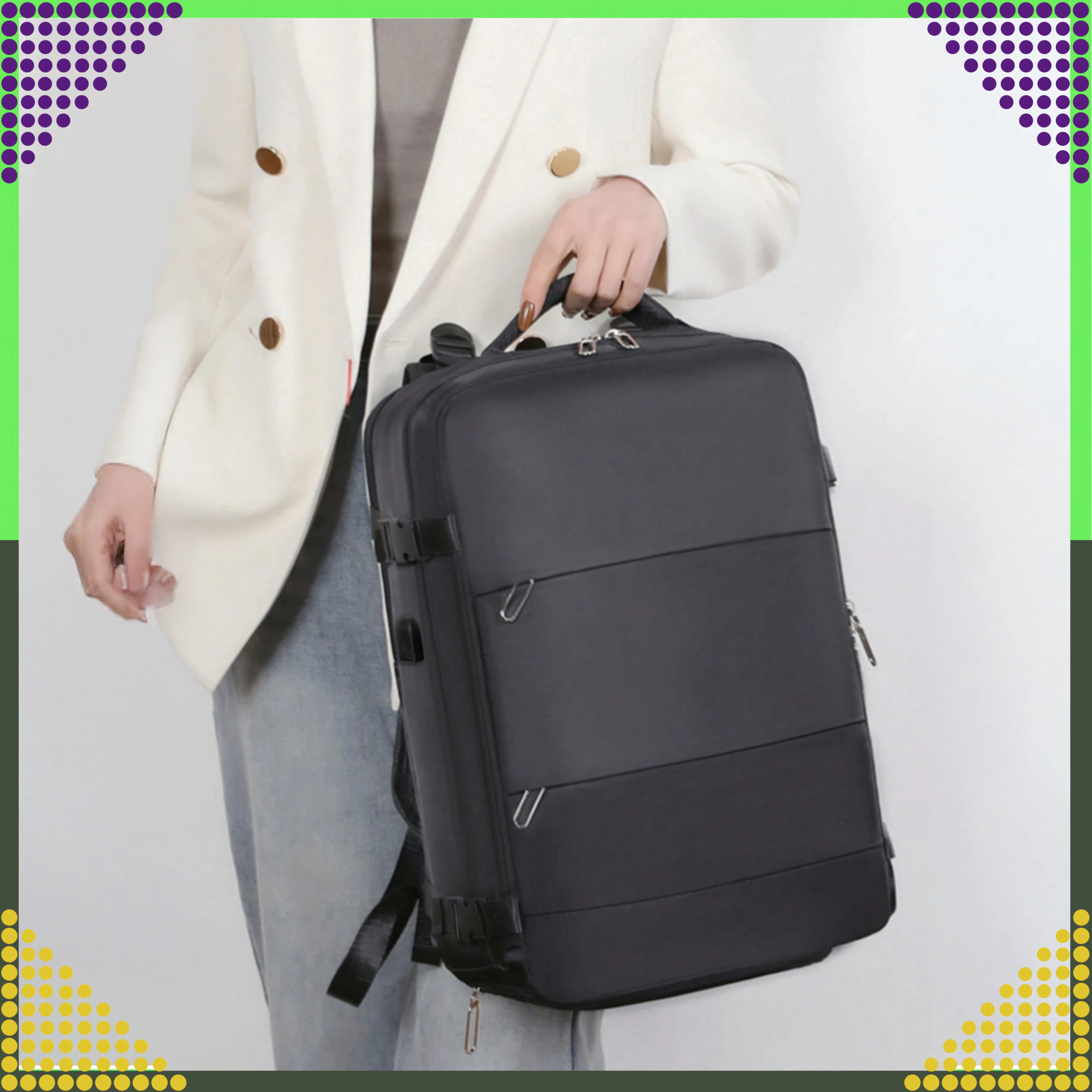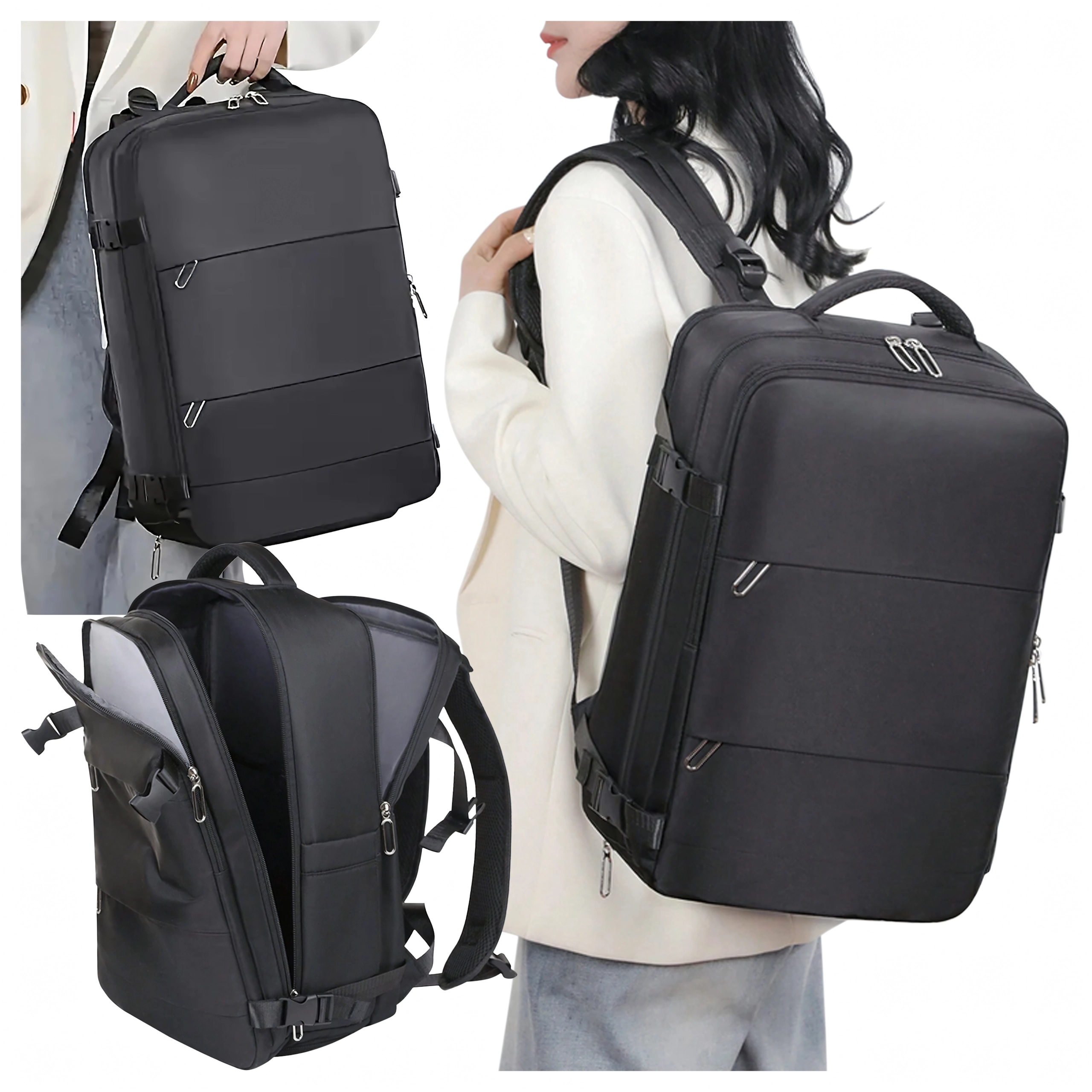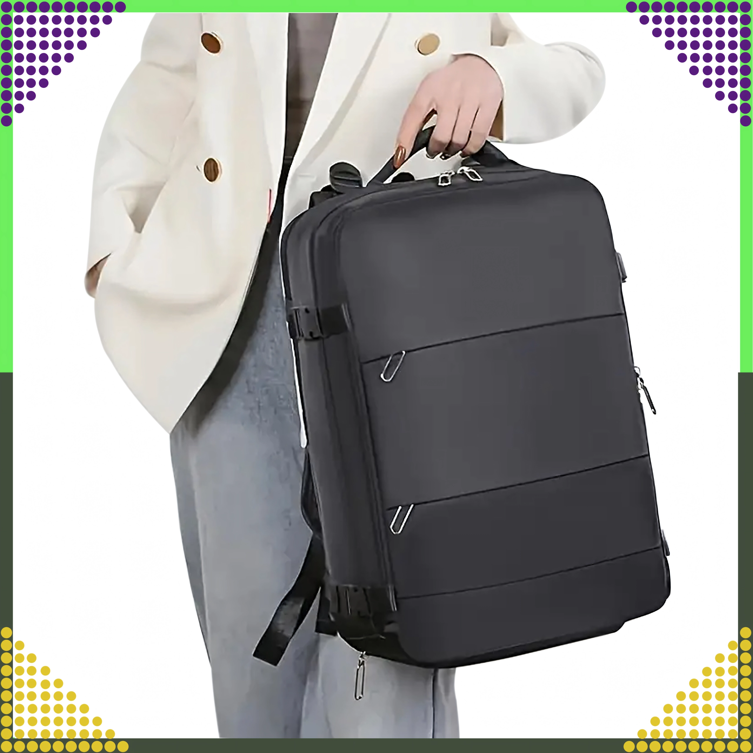 - Respectă dimensiunile pentru cabină: 46 × 30 × 20 cm (Ryanair, Wizz Air etc.)