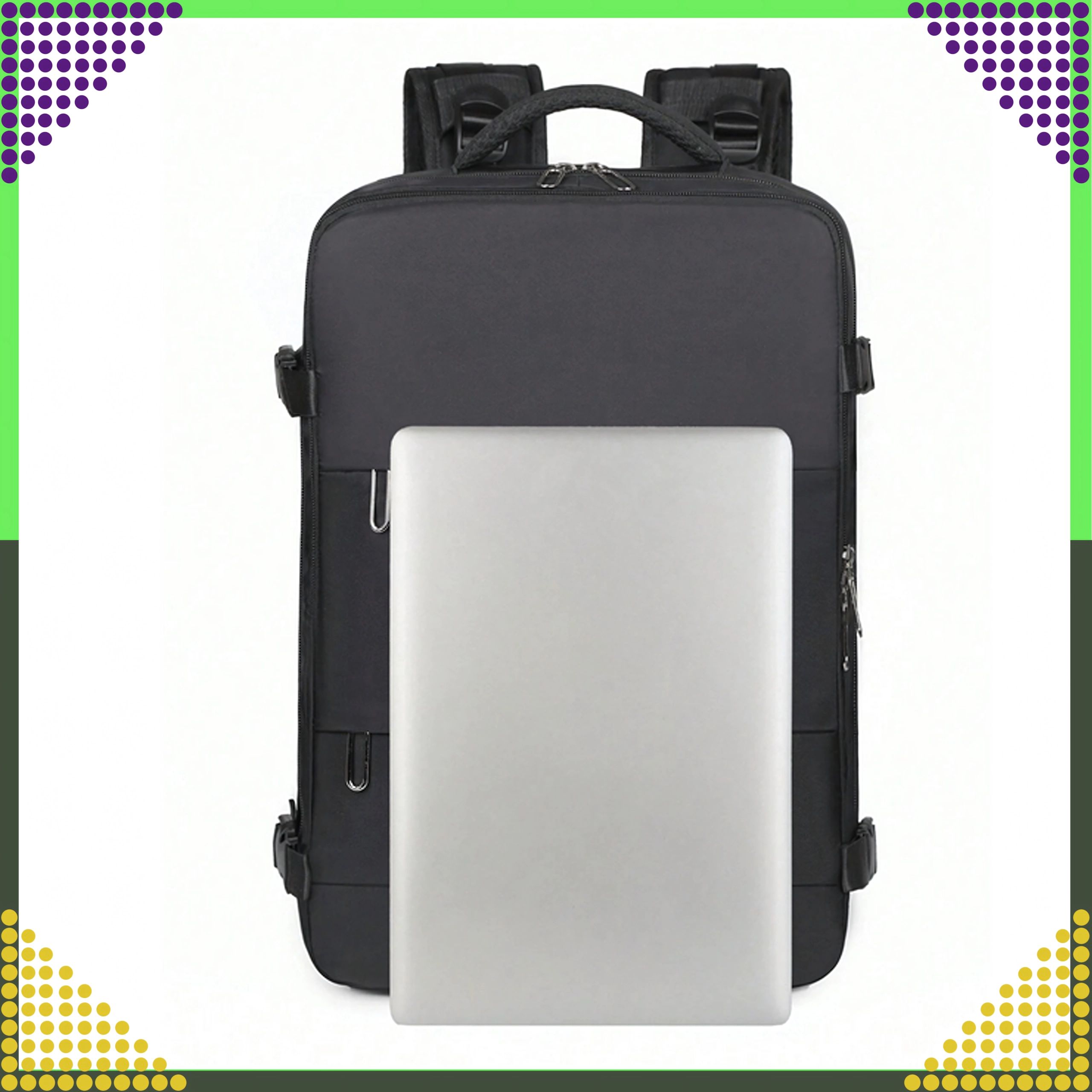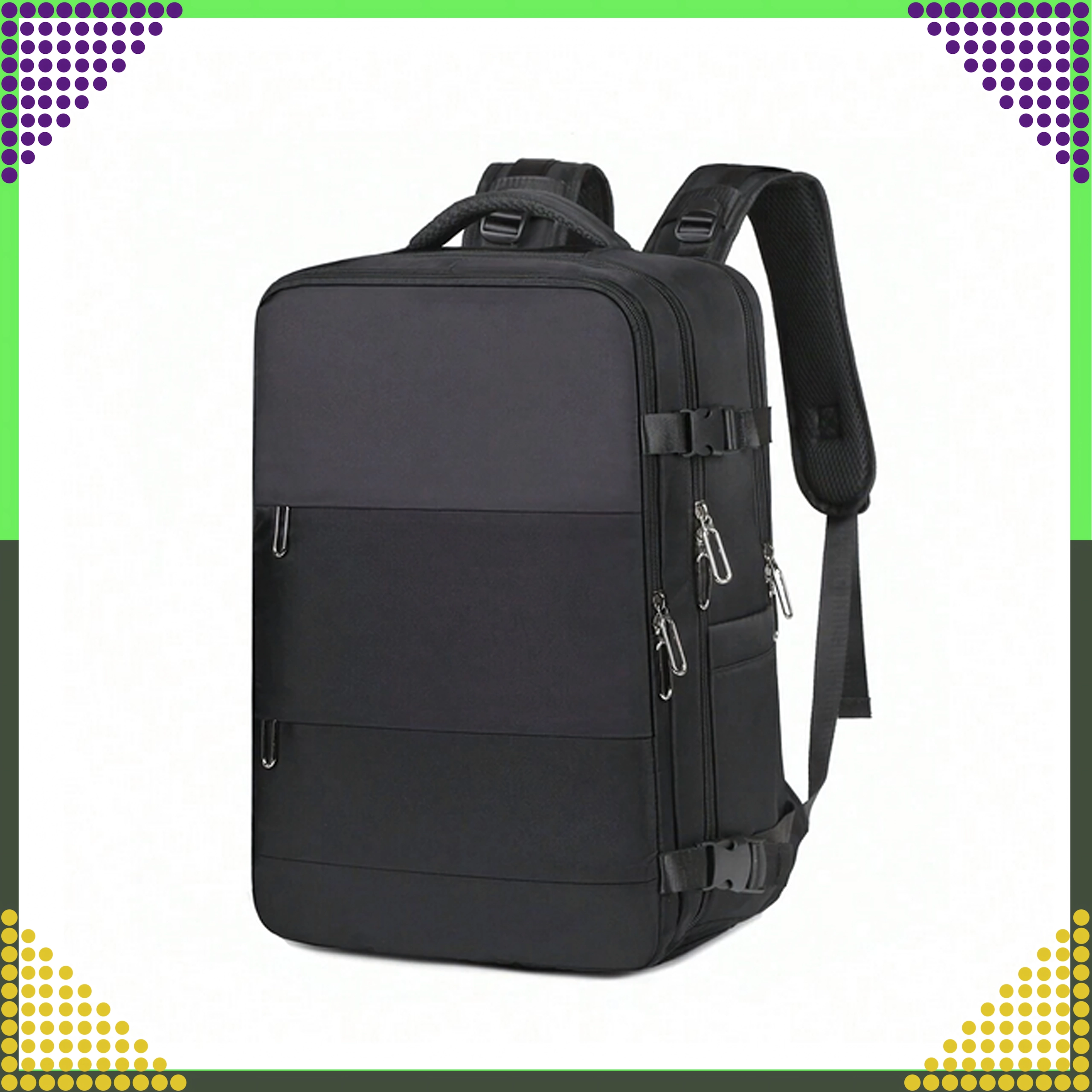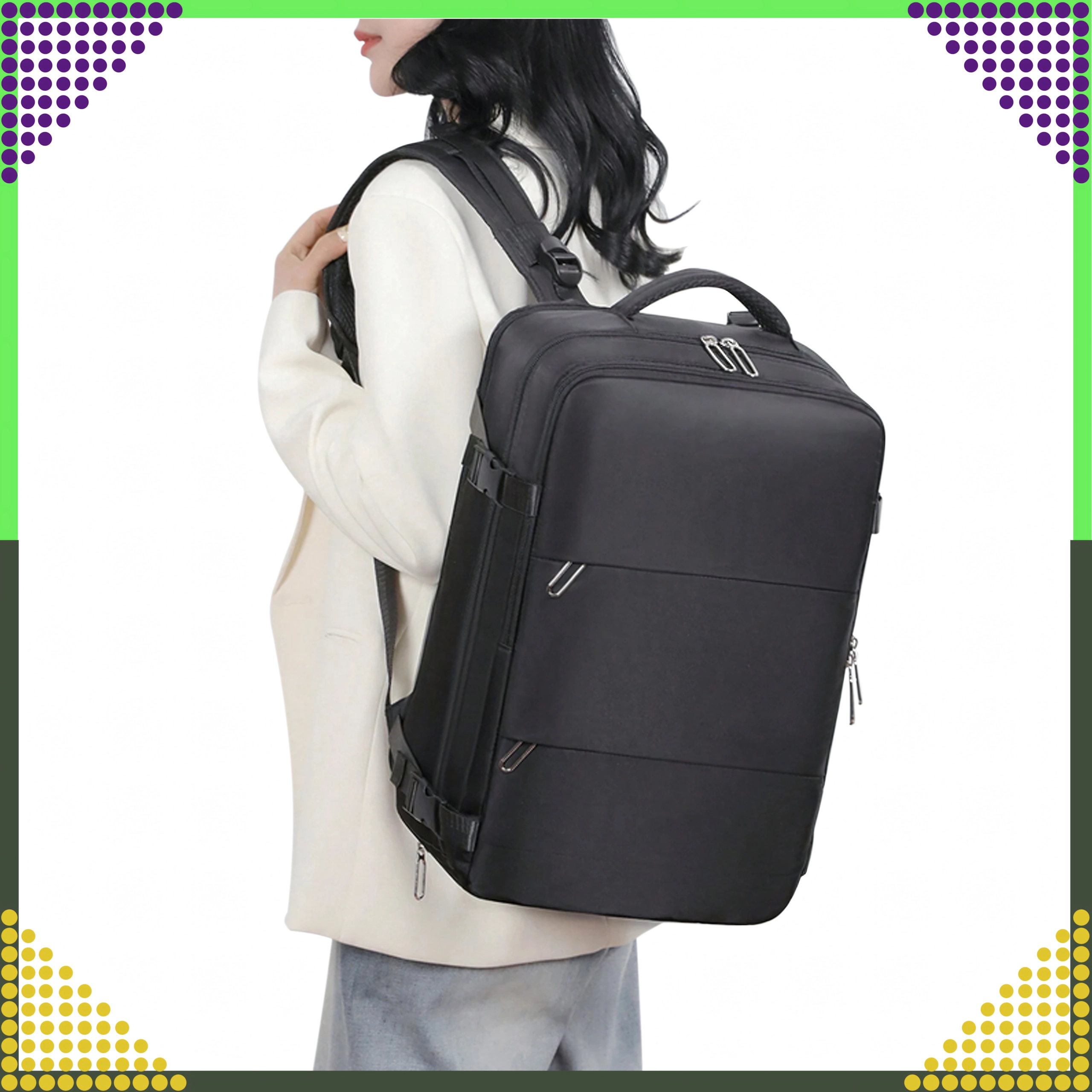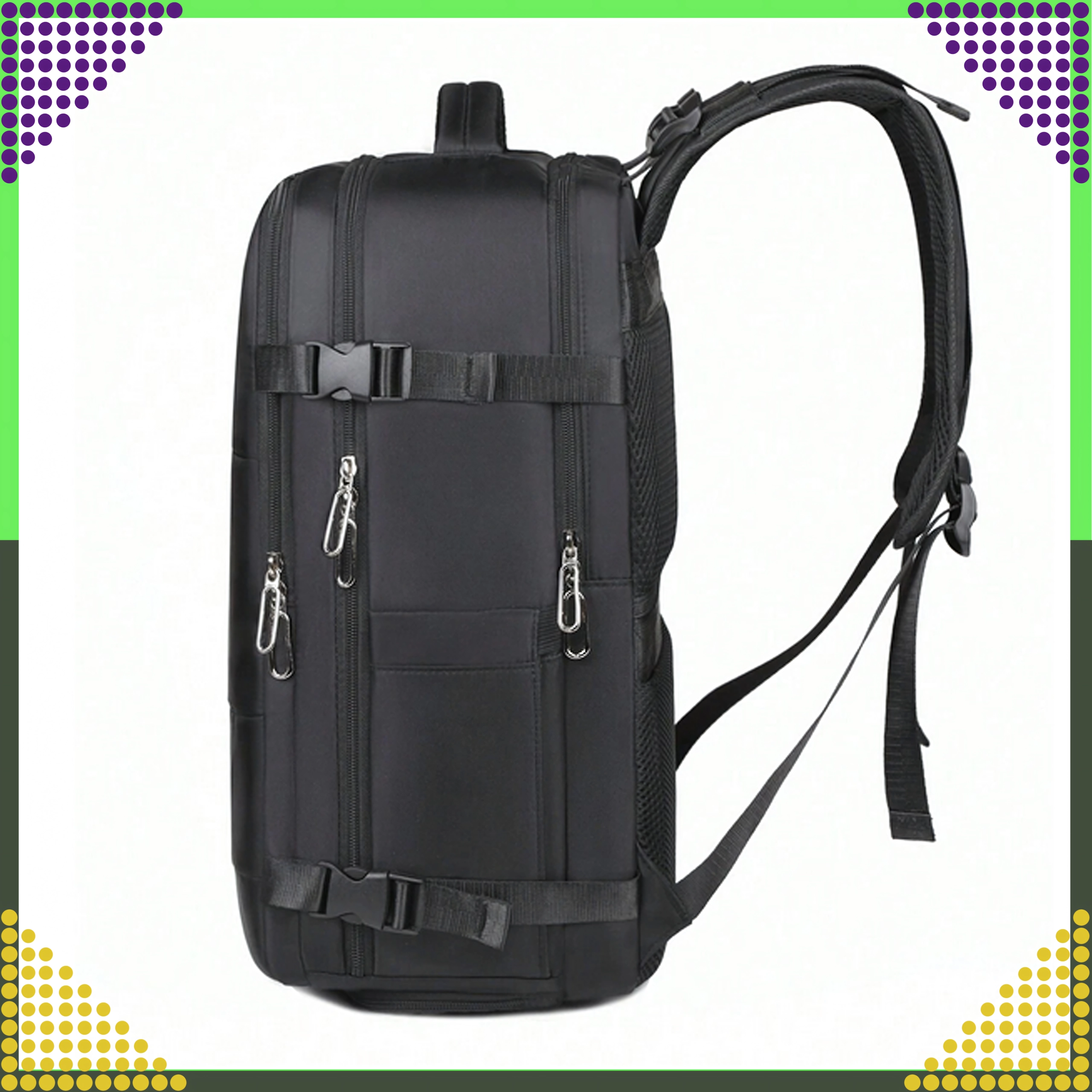 - Respectă dimensiunile pentru cabină: 46 × 30 × 20 cm (Ryanair, Wizz Air etc.)