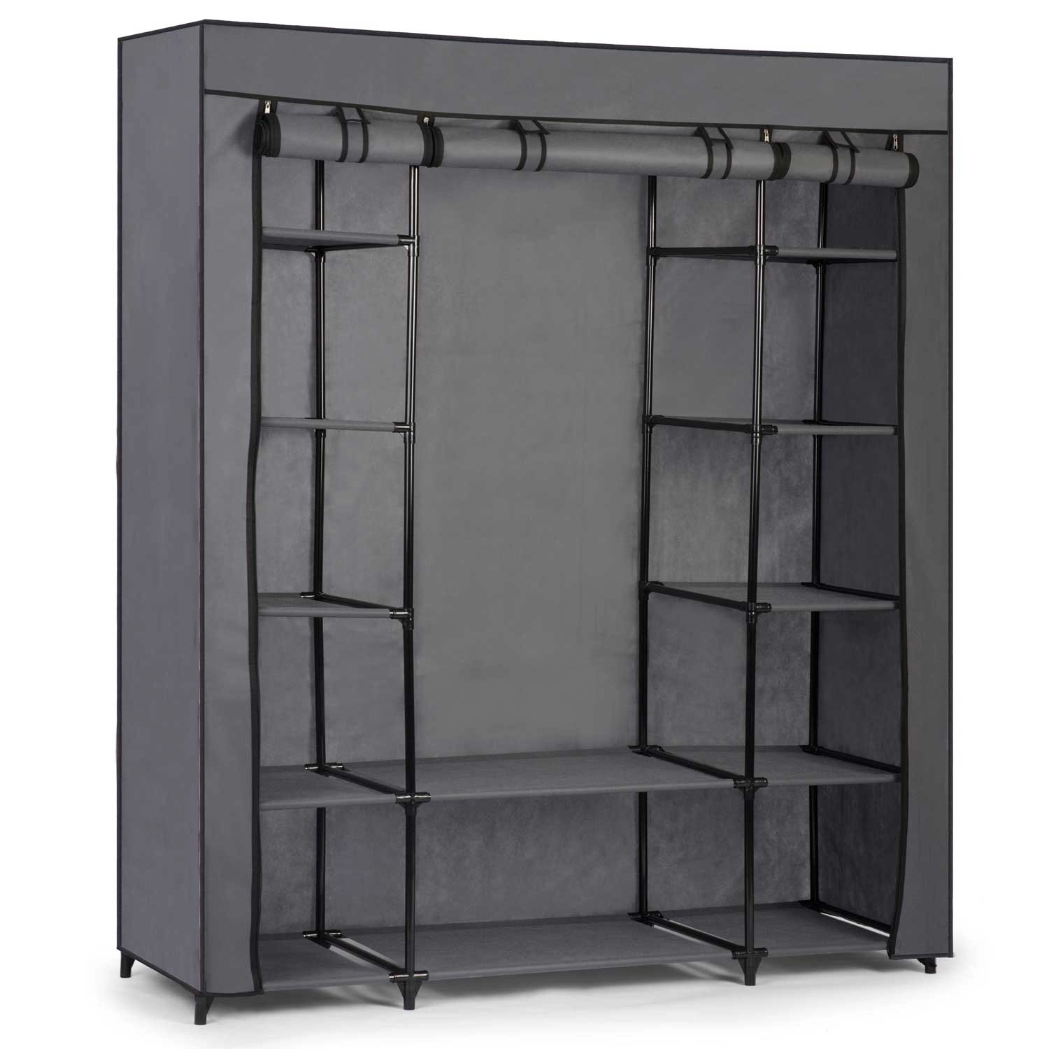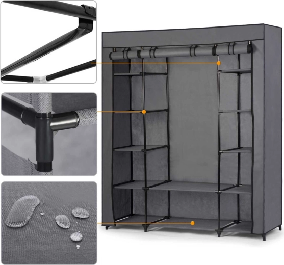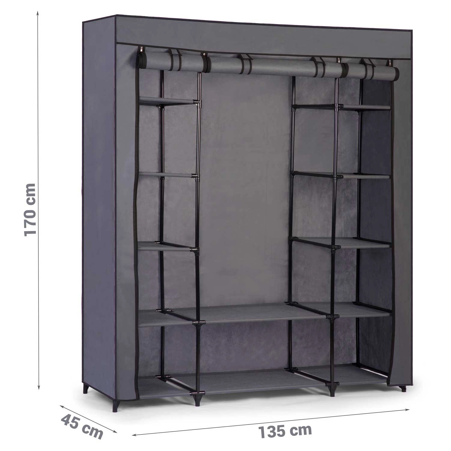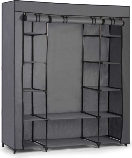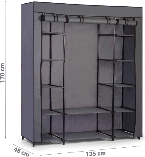 Practic și încăpător, dulapul textil Massido în culoare grafit oferă 12 rafturi solide, bară pentru umerașe și cadru din oțel pentru stabilitate ridicată. Trei secțiuni separate, fiecare cu propriile uși și patru fermoare, asigură acces comod și depozitare ordonată. Materialul rezistent la apă și asamblarea ușoară, intuitivă fac din acest dulap o soluție ideală pentru dormitor, dressing sau hol.