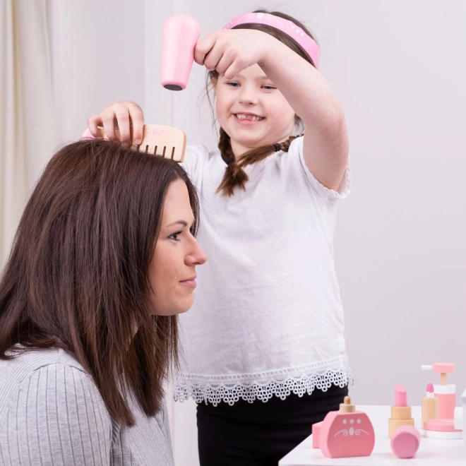 Adorabilul set din lemn cu 11 piese pentru jocul de-a salonul de frumusețe, în valiză portabilă, îi va încânta pe toți micii împătimiți ai cochetăriei de la 3 ani. Copiii se vor distra imitându-i pe adulți cu accesorii precum oglindă, pieptene, uscător de păr, ruj sau lac de unghii – dezvoltând în același timp creativitatea și motricitatea fină, precum și abilitățile sociale și de limbaj. Fabricat din materiale de calitate, sigure, conforme normelor europene.